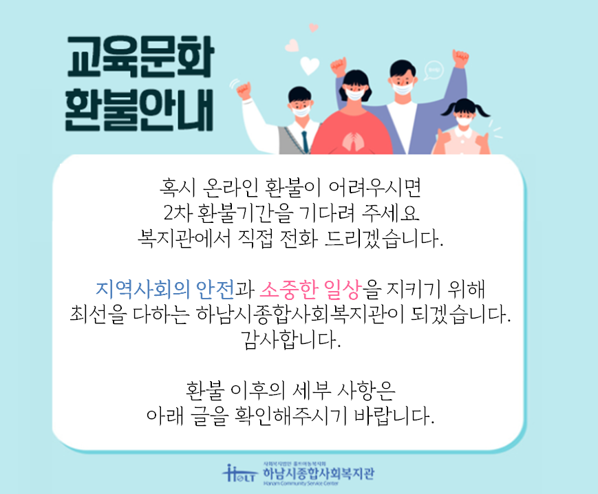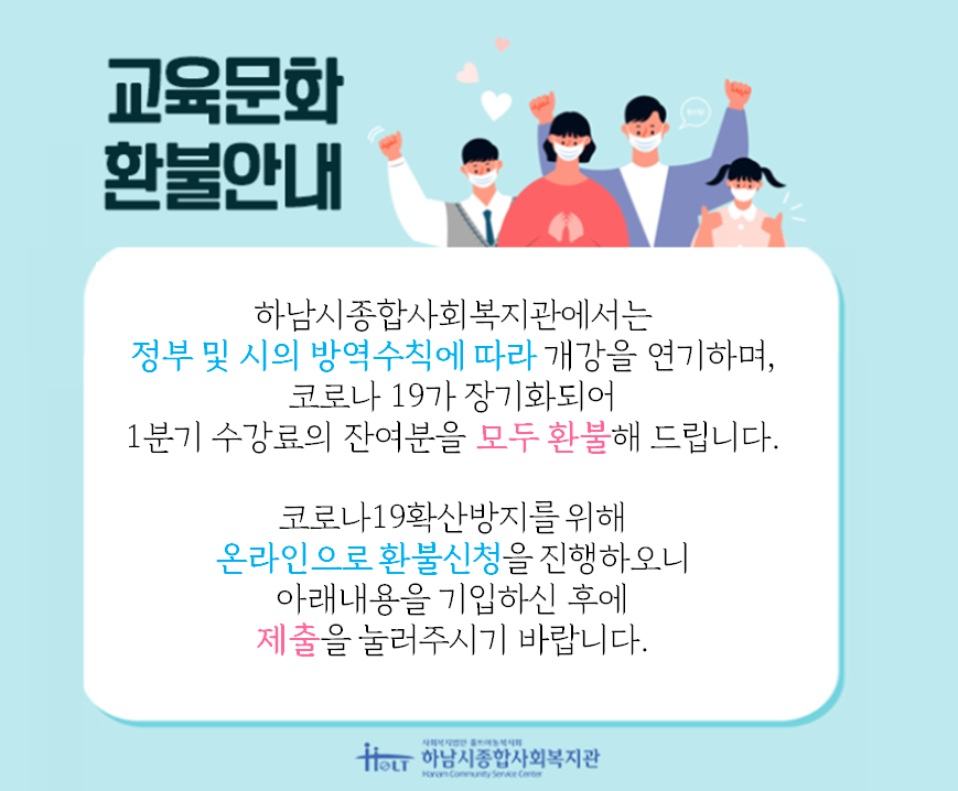 차후 개강 시 기존 회원분들에게 복지관 교육강좌 재개에 관하여 문자 및 홈페이지 게시를 통해 안내 드리겠습니다.
