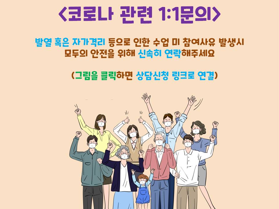 코로나 관련 문의 시 언제나 이 링크로 문의 남겨주시기 바랍니다. (아래 그림 클릭 시 '상담 신청' 링크 연결)