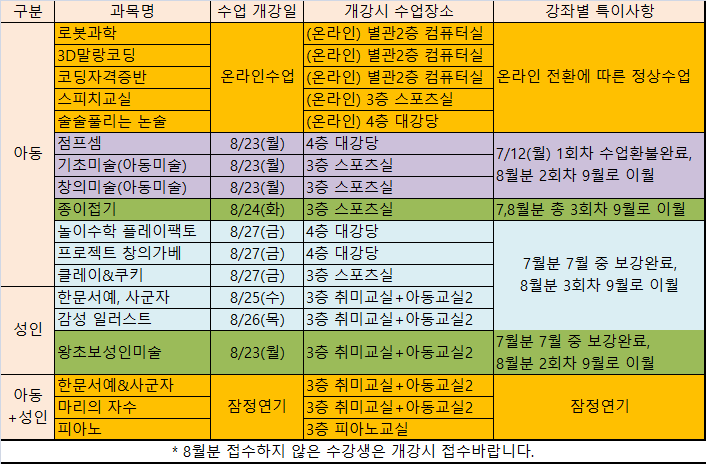 8/1(월)~9/5(일) : 대면 강좌 휴강
