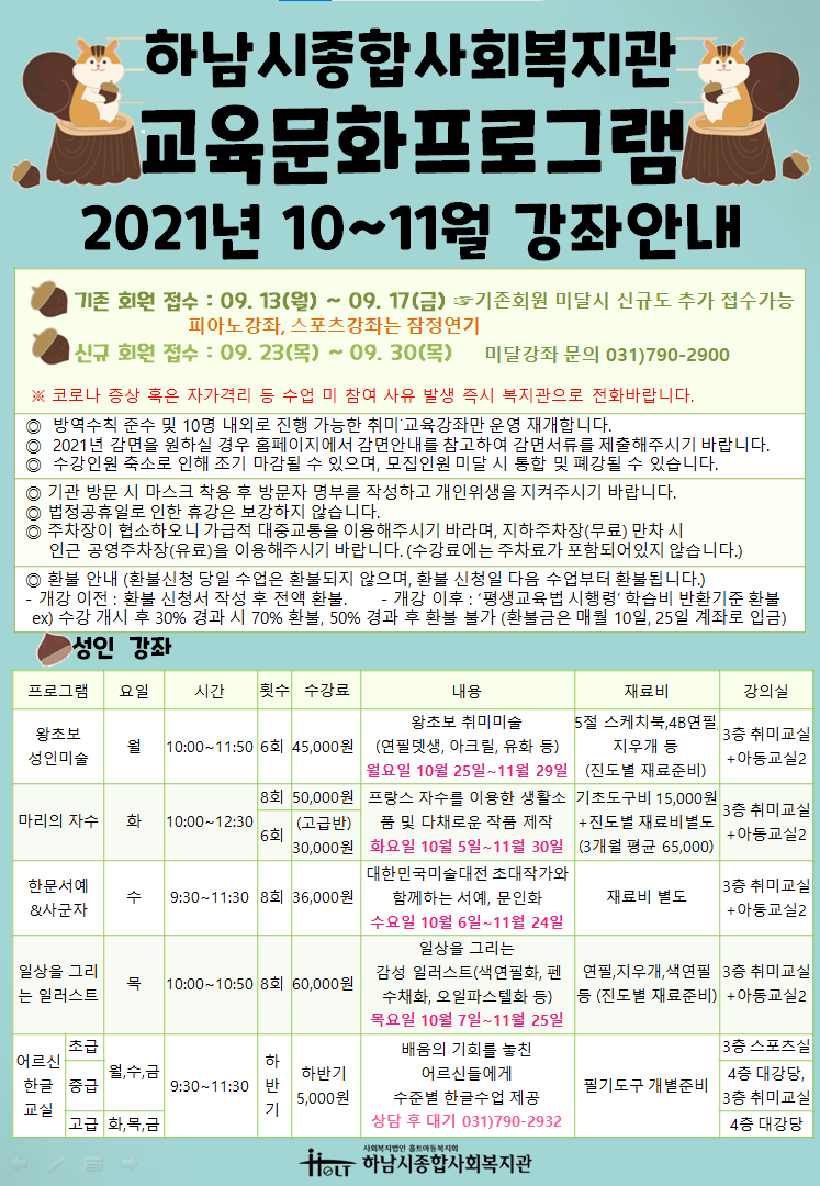10월 8일 개강강좌는 9월 13일부터 모든 회원 신규 수강생으로 전환되며,