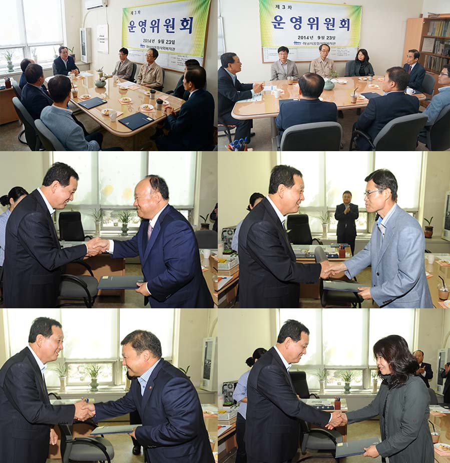 2014년 9월 23일 우리복지관에서 복지관 신규 운영위원 위촉식이 실시되었습니다. (주)승보산전 이종만 사장님, 영락노인복지센터 권기용 원장님, 국민건강보험공단 강성규 하남지사장님, 하남시장애인부모회 김말선 부회장님, 하남시청 황주명 주민생활지원과장님, 문창식 사회복지과장님, 우리복지관의 황환윤 관장님이 앞으로 3년간 하남시 지역사회복지발전을 위해 운영위원으로 수고하시게 되었습니다. 이종만 위원님이 위원장으로 선출되었고 복지관의 발전을 위해 모두 함께 나아갈 수 있는 상생의 길을 모색하시겠다는 포부를 밝히는 뜻깊은 시간을 가졌습니다. 감사합니다.