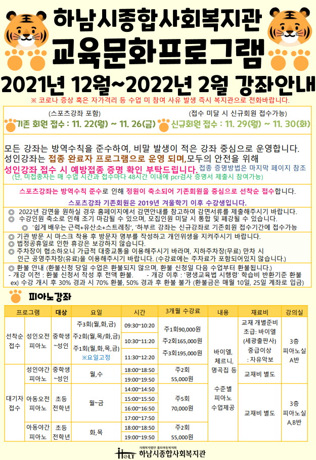 특히 성인강좌는 백신접종증명서(2차) 및 PCR검사 음성(48시간 이내) 확인 후 접수 할 수 있음에 따라,