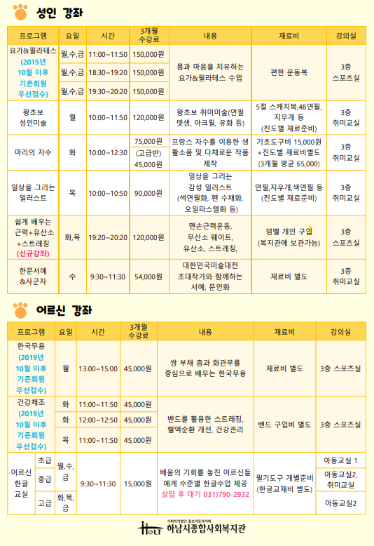 또한 모든 강좌는 방역수칙을 준수하여, 비교적 비말 발생이 적은 강좌를 우선적으로 운영합니다. 움직임이 적은 강좌부터 점진적으로 개강하며, 스포츠강좌의 정원 감소로 기존회원 중 선착순으로 접수를 진행합니다.