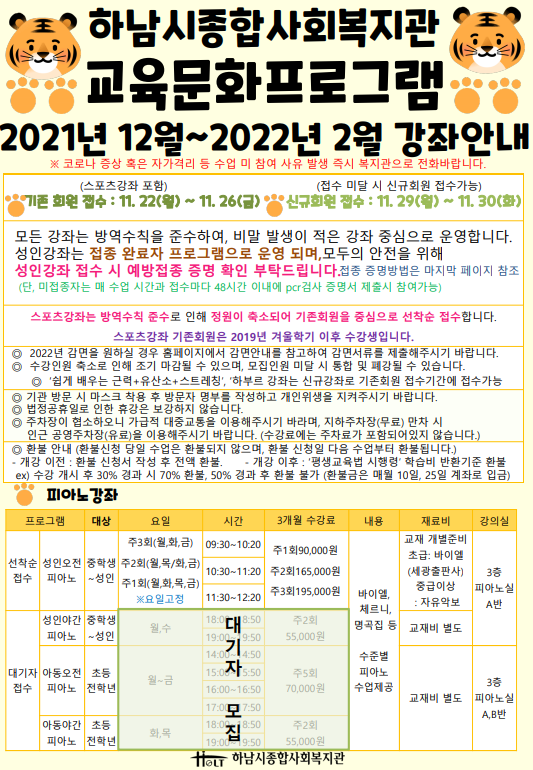 2021.11.29.(월)~21.11.30.(화)까지 기존회원 미달강좌에 한해 추가접수합니다.