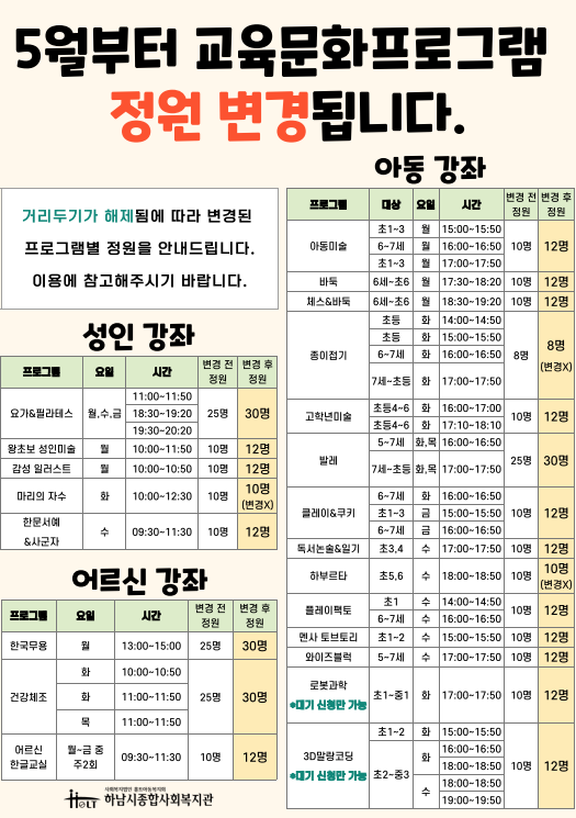 거리두기 전면 해제에 따라 프로그램별로 변경된 정원을 안내드립니다.