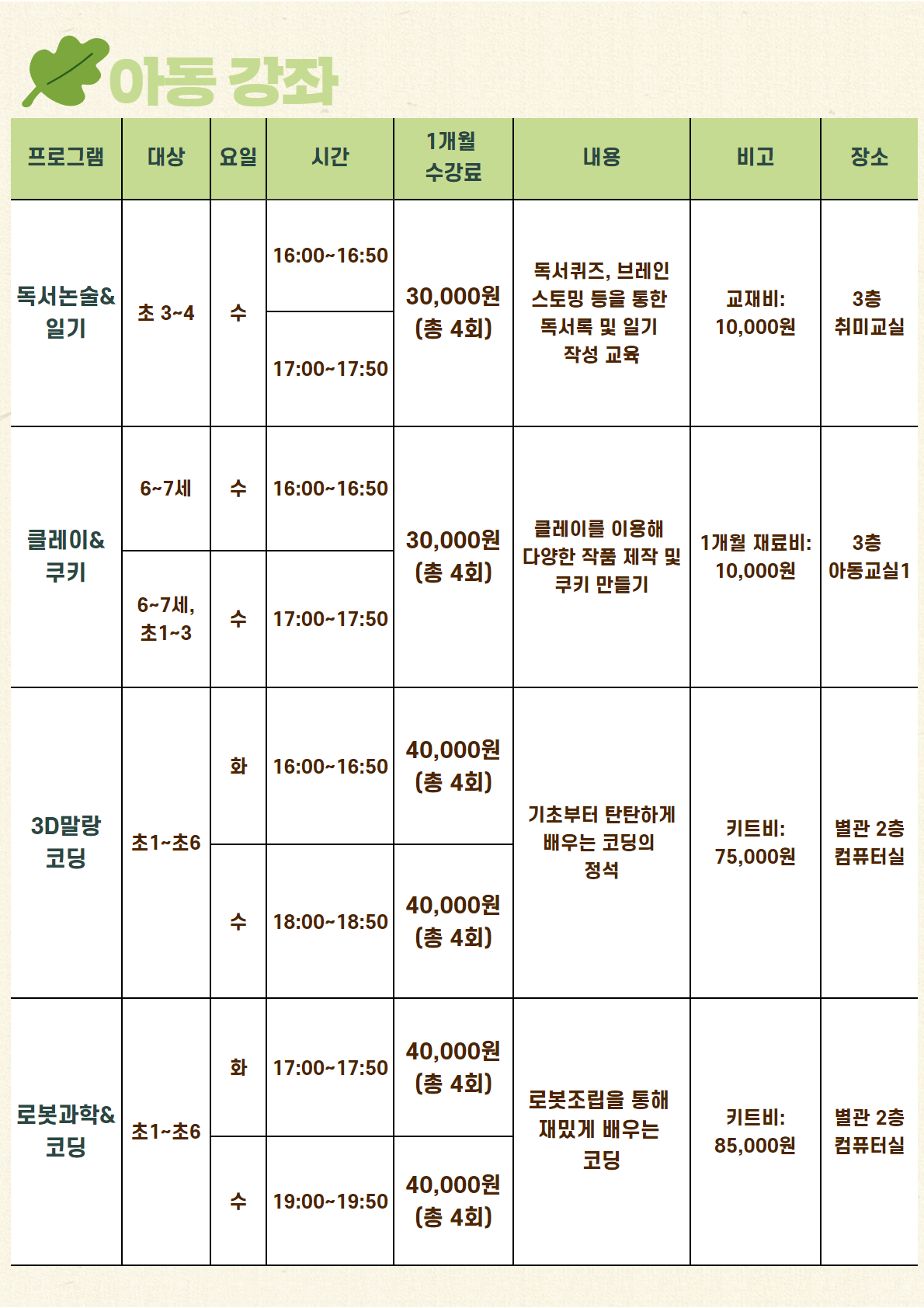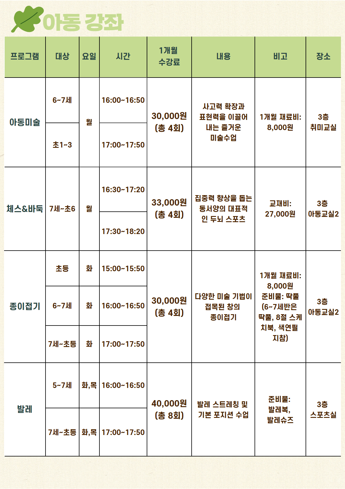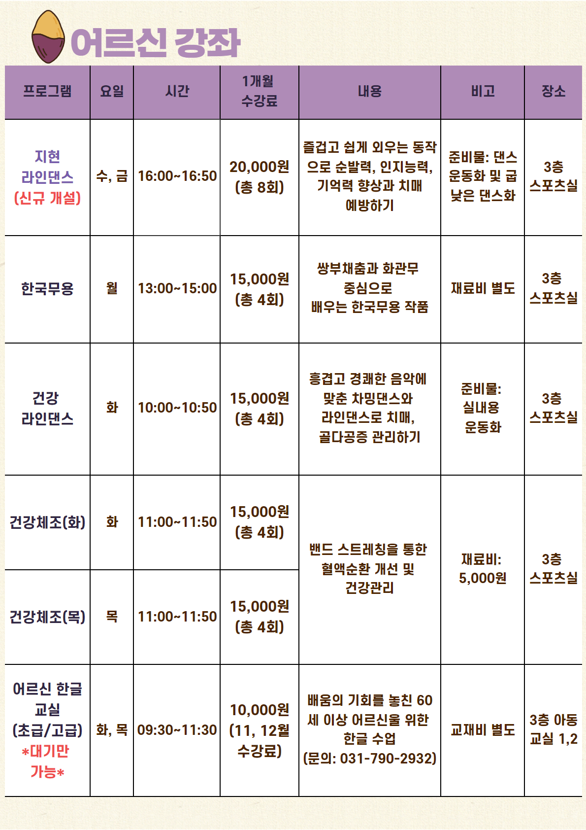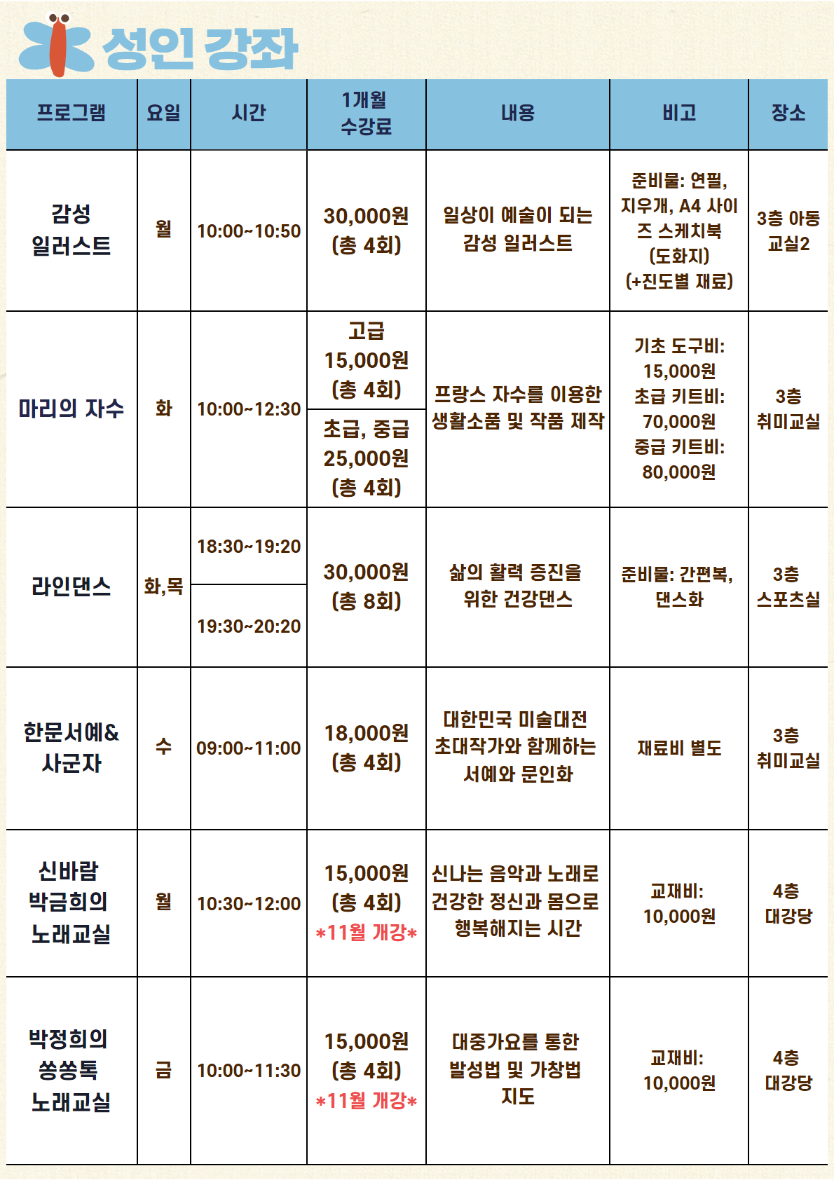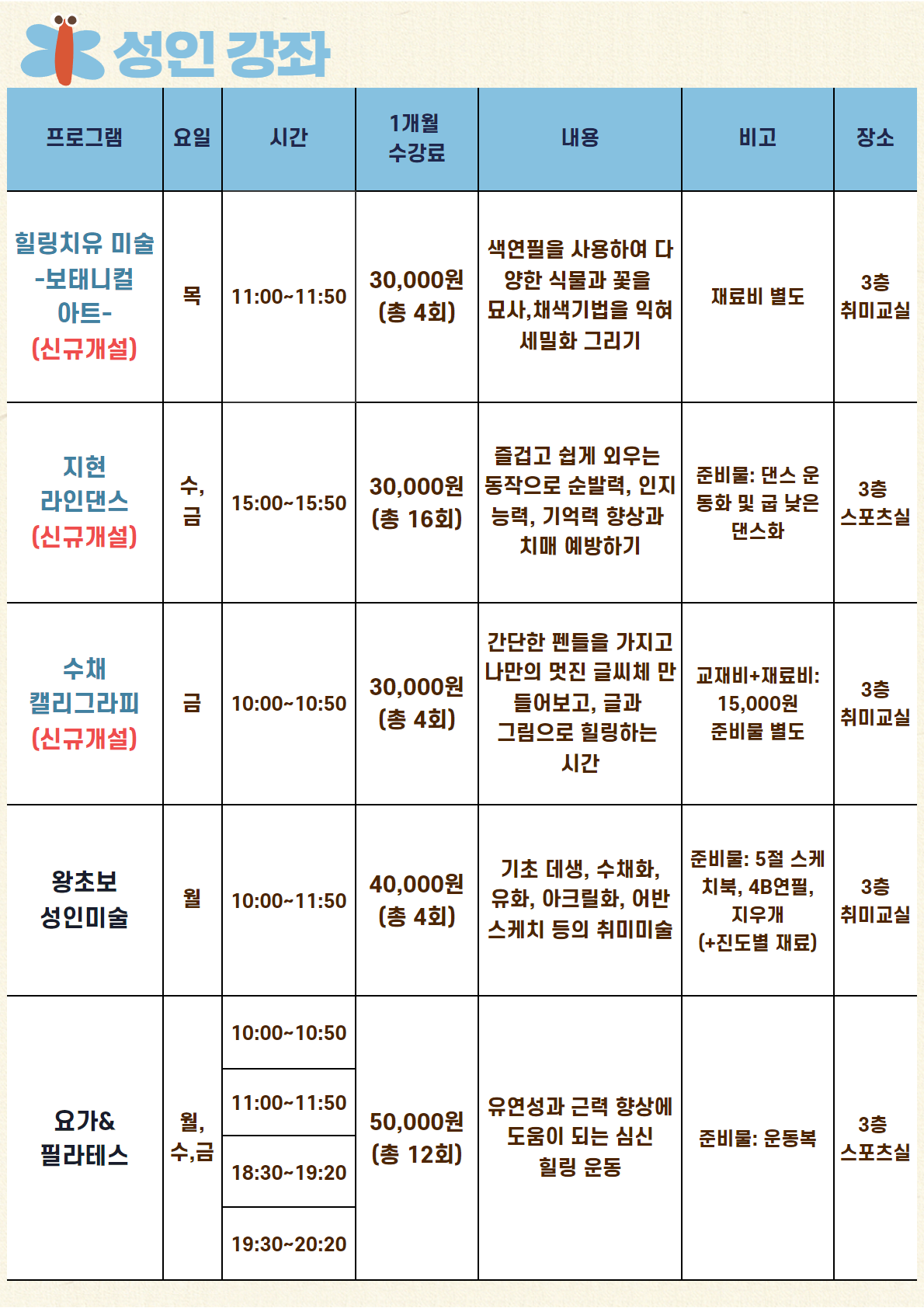 *신규강좌 개설: 지현 라인댄스(성인, 어르신), 힐링치유미술- 보태니컬 아트(성인), 수채 캘리그라피(성인),