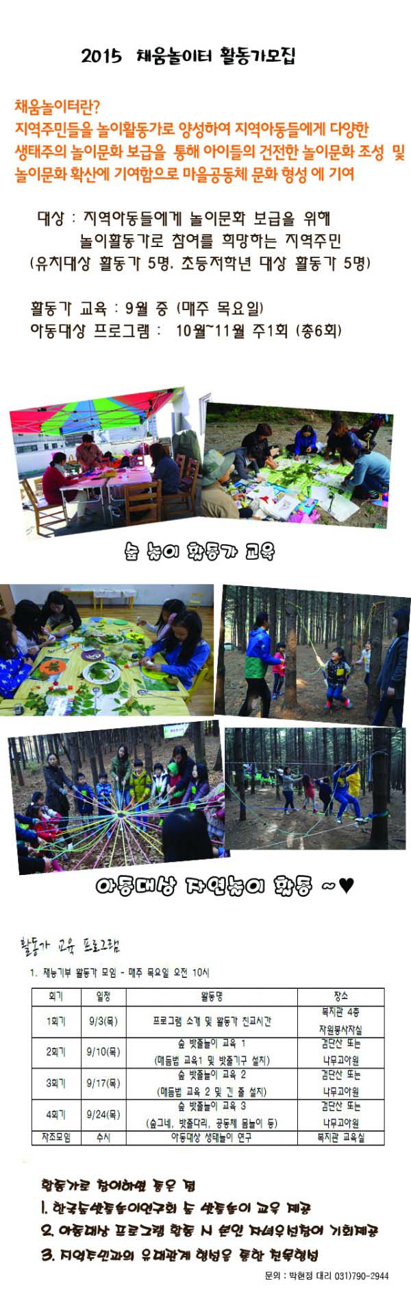 채움놀이터 활동가 모집에 관심있으신 지역주민께서는 전화로 문의해 주시기 바랍니다.