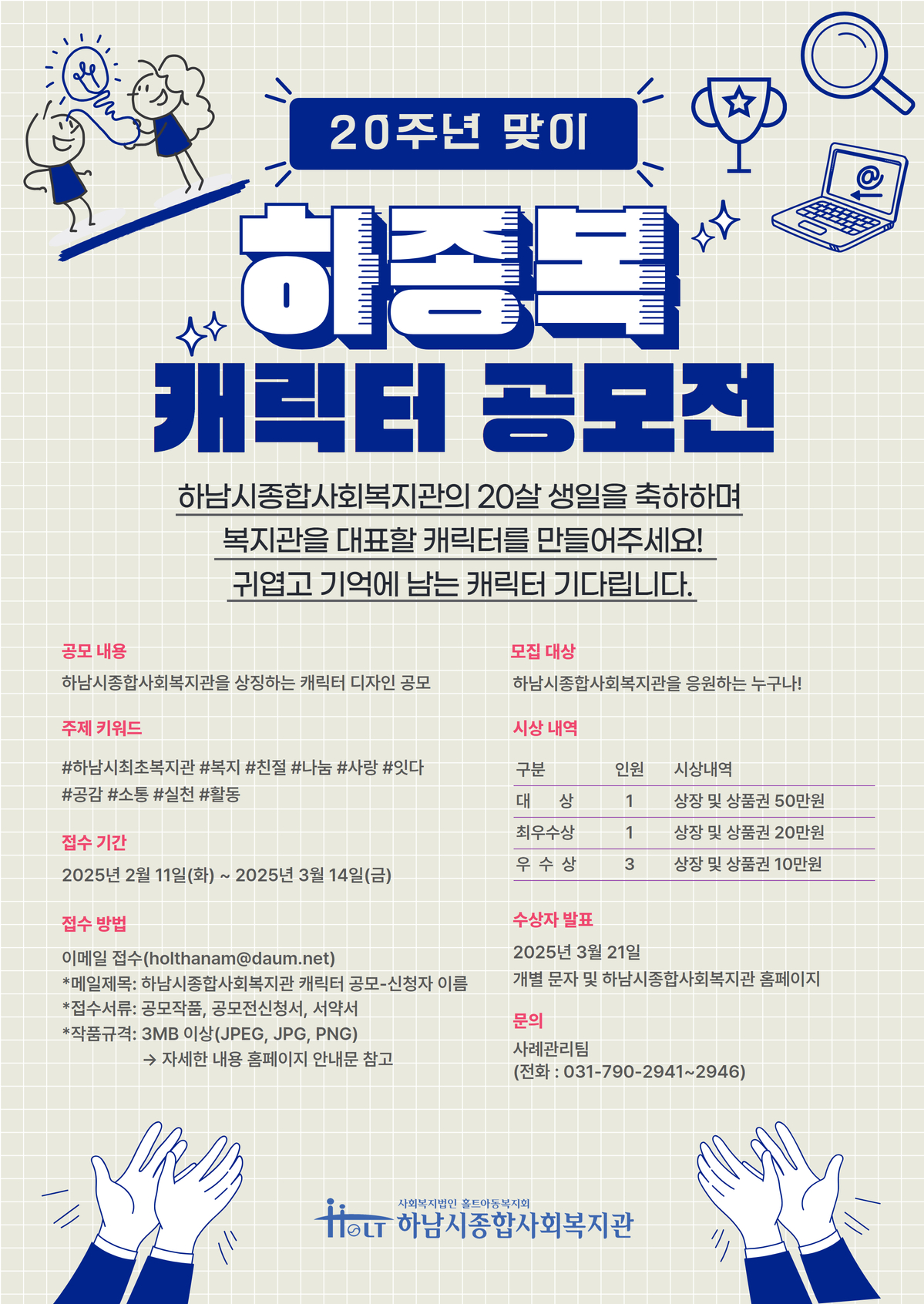 ▪ 접수방법: 이메일 접수 holthanam@daum.net (메일제목: 하남시종합사회복지관 캐릭터 공모-신청자 이름)