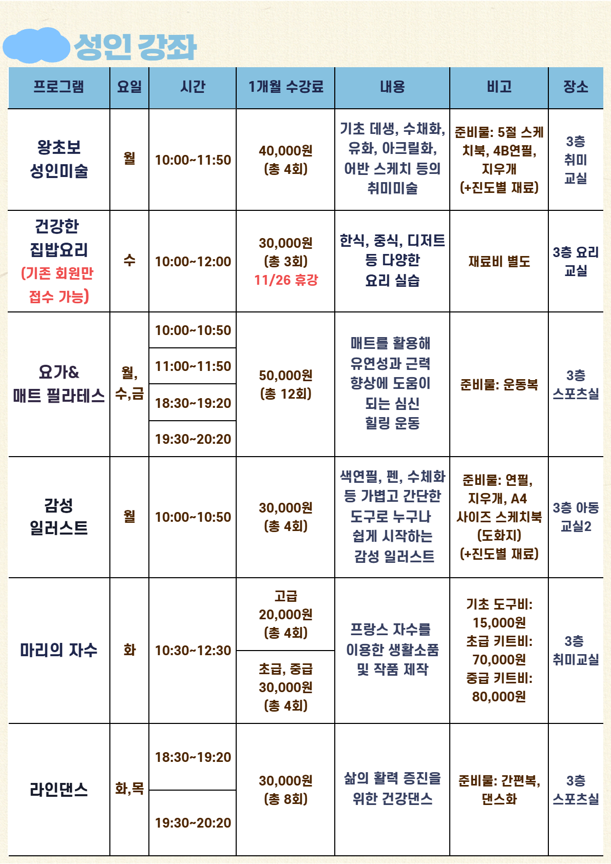 신규회원은 강좌별 잔여인원에 한해 접수 가능합니다.