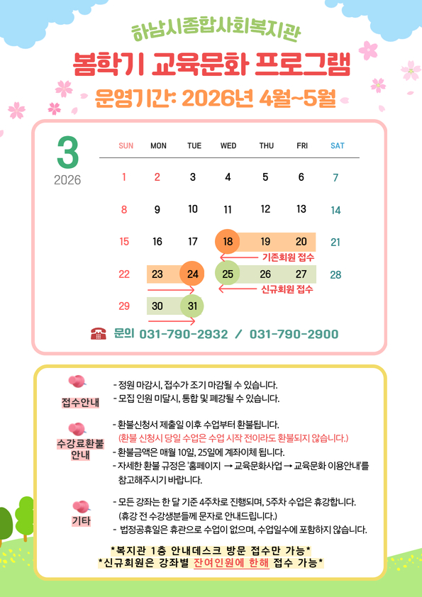 * 기존회원 온라인, 방문 접수: 3/18(수)~3/24(화)