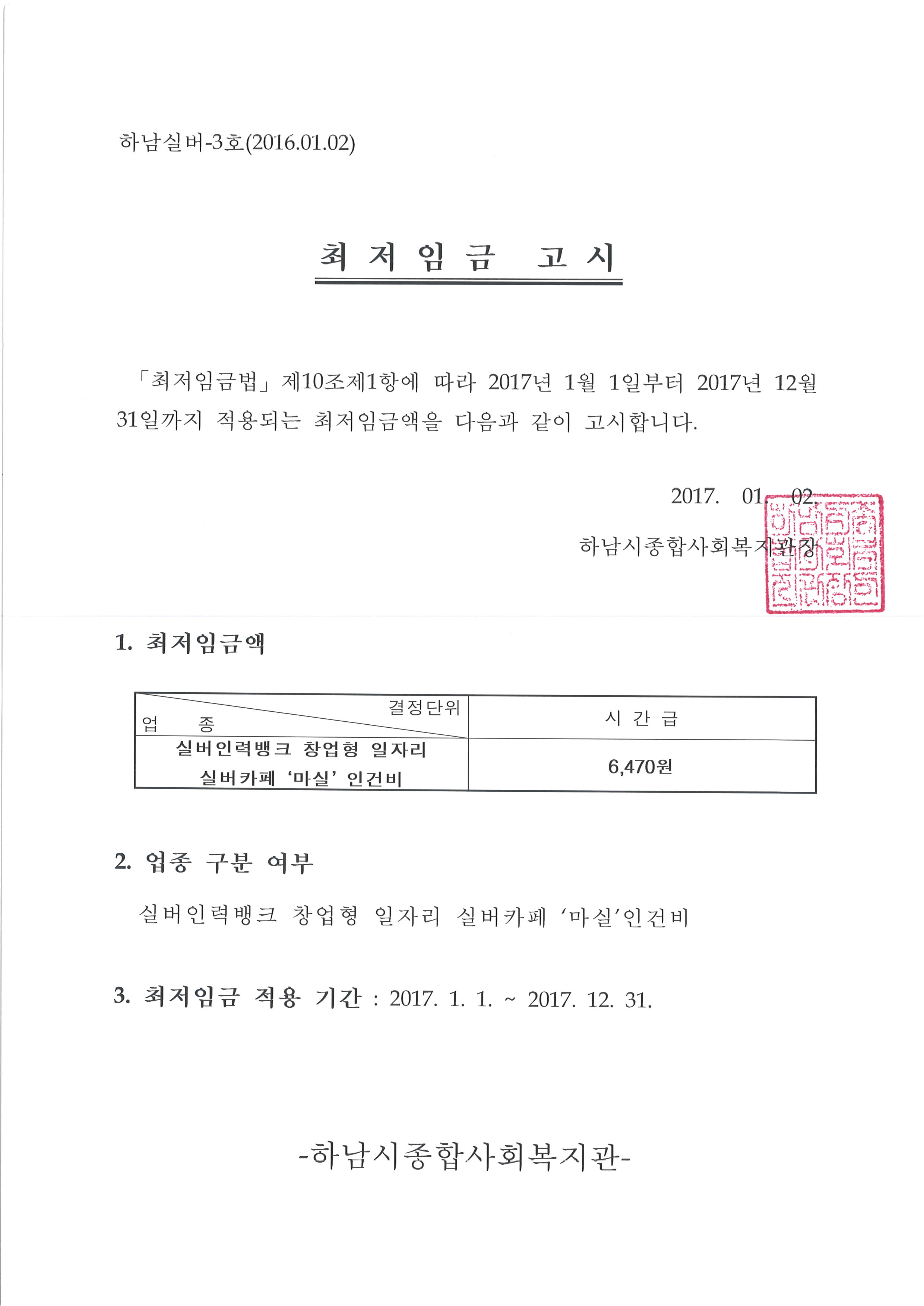 3. 공고내용 : 2017년도 최저임금 고시