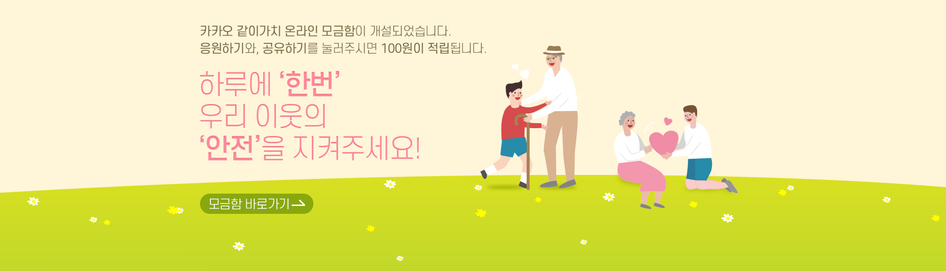 안녕하세요.하남시종합사회복지관 입니다.카카오 같이가치온라인 모금함이 개설되었습니다.하단의 [온라인 모금함]링크로 접속하셔서(댓글),(응원하기), (공유)를꾸욱~ 눌러주시면각각 100원씩 적립이 됩니다.소중한 후원금은 우리 지역사회의어려운 독거노인 100가정의결식예방을 위해 사용됩니다.하루에 ‘한번’우리 이웃의 ‘안전’을지켜주세요많은 참여와 관심 부탁드립니다.