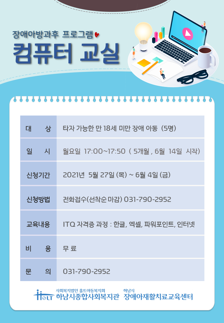 하남시종합사회복지관에서 장애아동을 대상으로 아래와 같이 컴퓨터 교육을 실시합니다.