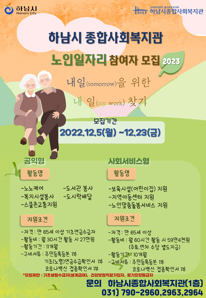 2023년 하남시종합사회복지관 노인 일자리 참여자 모집 합니다.