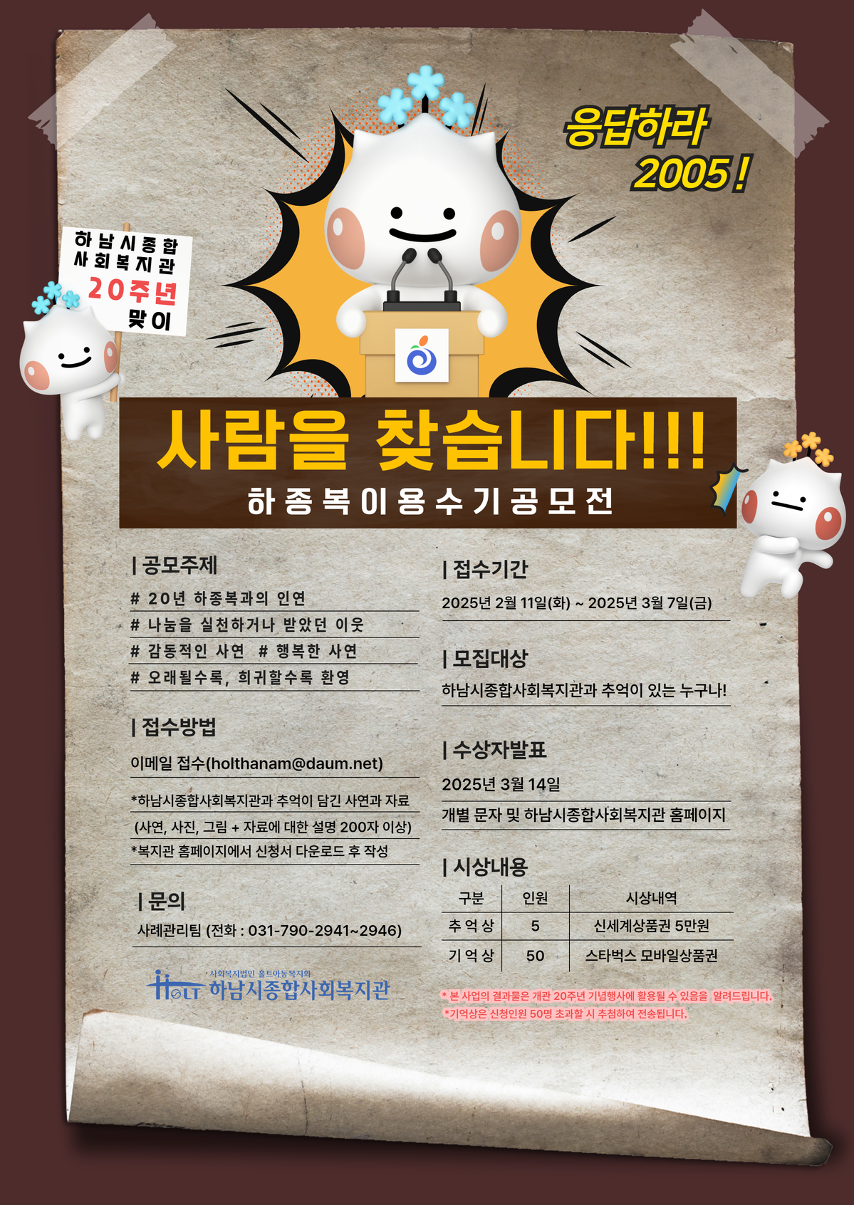 2025년 우리복지관 개관 20주년 맞이 이용수기 공모전을 개최합니다.