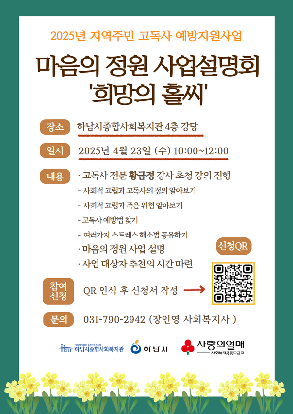고독사 예방 강의 진행과 마음의 정원 사업 설명회가 진행됩니다.