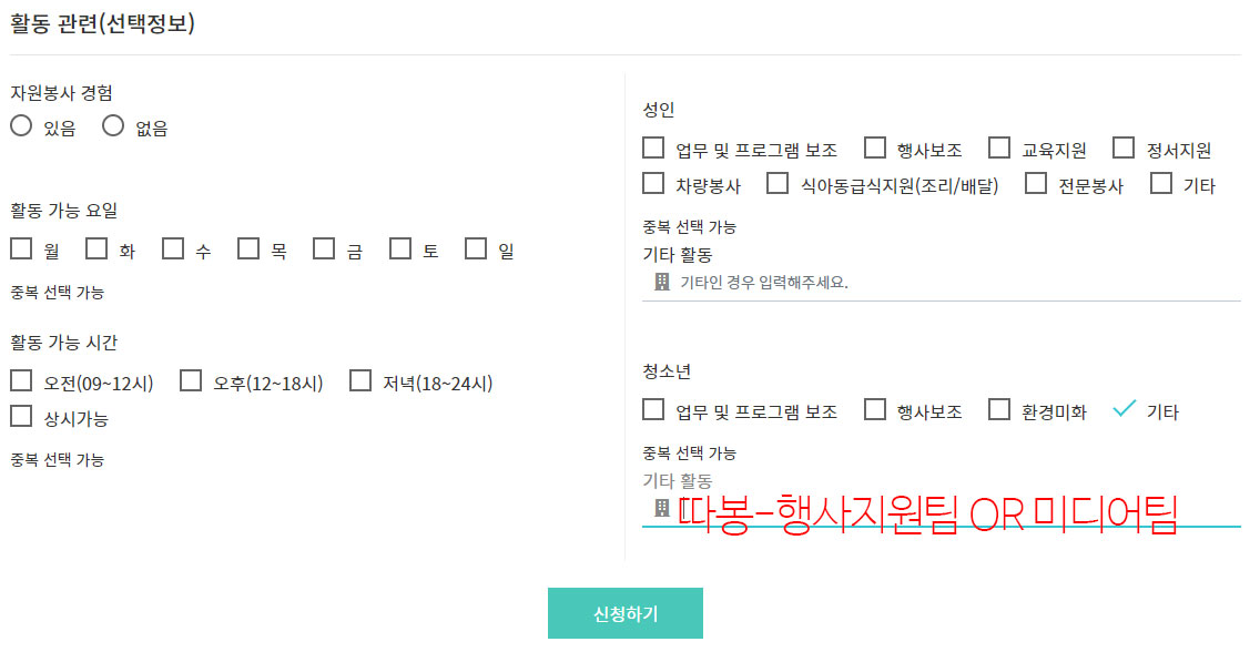 3. 신청내용 작성 시 활동관련(선택정보)에 지원팀 반드시 기재