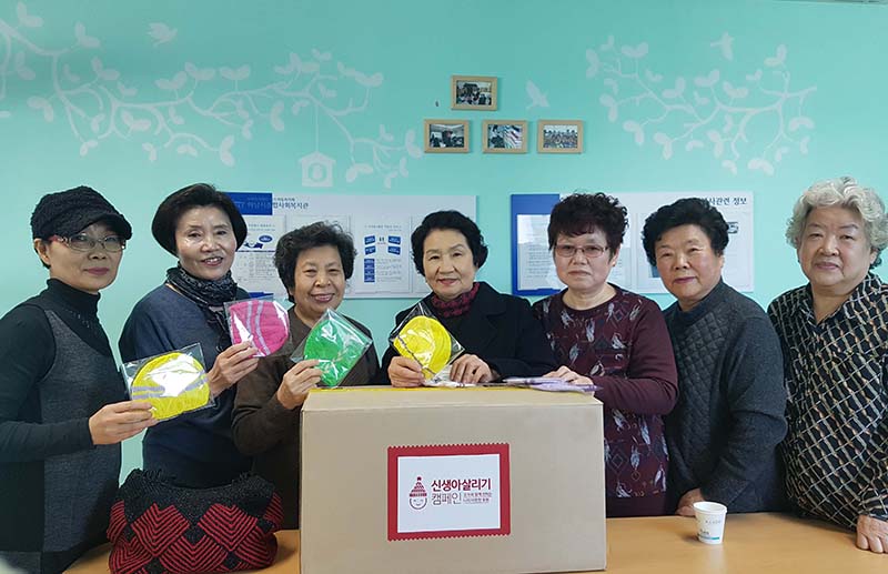 손사랑 나눔 동아리 모자후원 활동 작성일 : 2018.03.08 | 조회수 : 11979 손사랑(뜨개질) 나눔 동아리의 어르신 9분이 직접 떠서 완성한 신생아 모자 505개를 세이브더 칠드런의 '신생아 살리기 캠페인'으로 보내도록 하였습니다. 어르신들의 솜씨와 정성으로 따뜻한 나눔을 실천할 수 있었습니다.해외의 많은 아동들이 따뜻한 모자로 생명을 이어갈 수 있기를 바랍니다.
