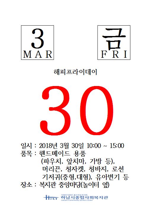 2018년 3월 해피프라이데이 진행 작성일 : 2018.03.15 | 조회수 : 12436 지역사회 저소득 가정 지원 사업비 마련을 위한 해피프라이데이 상설매장을 실시합니다 - 다 음 - 1. 일시 : 2018. 3. 30(금) 10:00~16:00 2. 장소 : 복지관 1층 중앙마당 많은 관심과 참여 부탁드립니다.