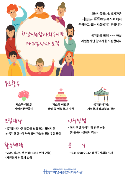 하남시종합사회복지관 자원봉사단 모집 작성일 : 2018.03.20 | 조회수 : 12531 하남시종합사회복지관과 함께 함께할 자원봉사단 참여자를 모집합니다~~~4월 중에 카네이션 만들기를 진행할 예정이니 관심있는 분들의 많은 참여 부탁드립니다.^^