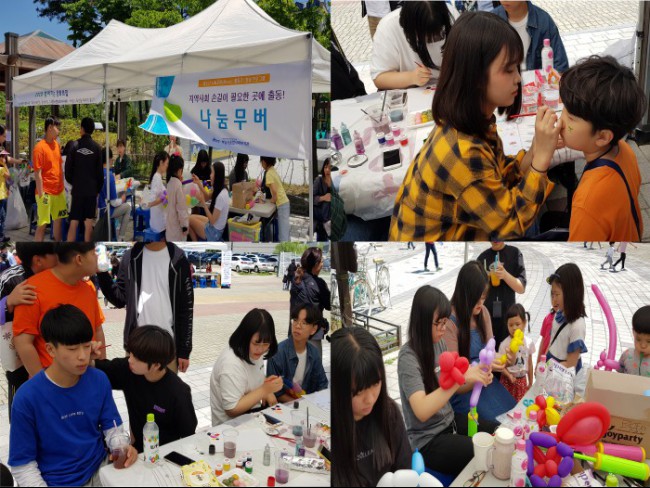 2018년 나눔무버 5기 재능팀 나눔활동 실시 작성일 : 2018.05.21 | 조회수 : 11915 일 시 : 2018. 5. 19(토) 11:00~15:00장 소 : 풍산3호 근린공원 (이마트) 뒤 야외광장 청소년 나눔무버(Mover:활동가) 5기 재능팀 나눔활동을 진행하였습니다. 하남시 덕풍청소년문화의집과 연계하여 페인스페인팅, 풍선아트 재능나눔실천으로청소년 나눔무버 재능팀이 행사부스를 진행하였습니다. 청소년 나눔활동가로써 앞으로 더 많은 나눔활동을 실천하겠습니다. *^^*