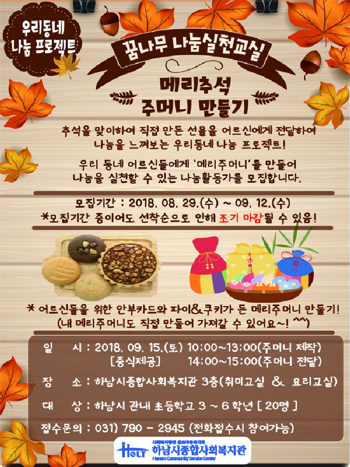 꿈나무 나눔실천교실 6기 메리추석주머니 만들기에 참여할 나눔활동가 모집을 실시합니다~ ^^