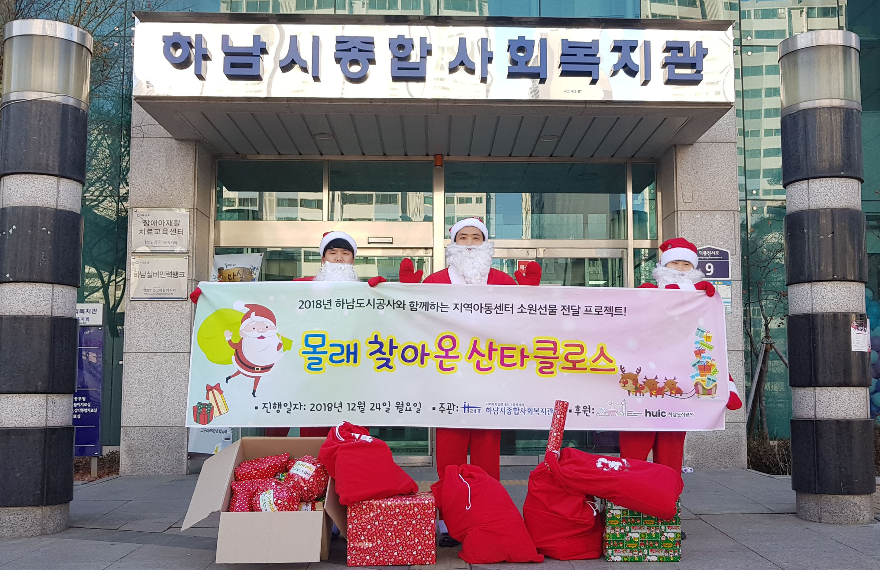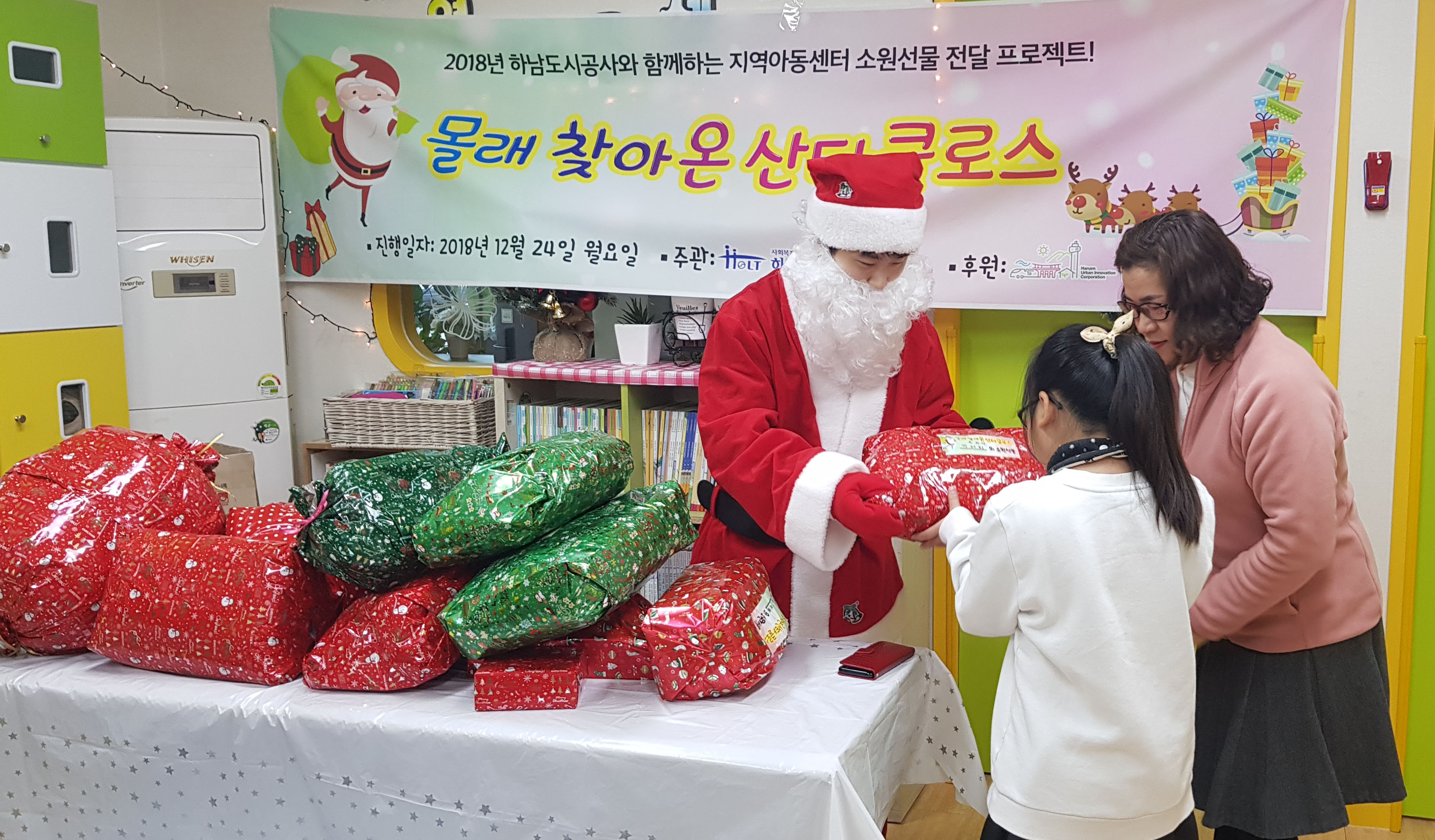 몰래 찾아온 산타클로스 작성일 : 2018.12.24 | 조회수 : 11590 2018. 12. 24(월) 15:00~18:00 하남도시공사에서 지원하는 '몰래 찾아온 산타클로스'가 진행되었습니다. 하남도시공사 직원분들이 직접 봉사로 참여하였으며, 관내 지역아동센터를 방문하여 이용 아동 및 청소년 384명에게 소원선물과 맛있는 간식을 전달하였습니다. 아이들에게 좋은 추억을 선물해준 하남도시공사에 감사드립니다.