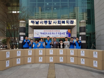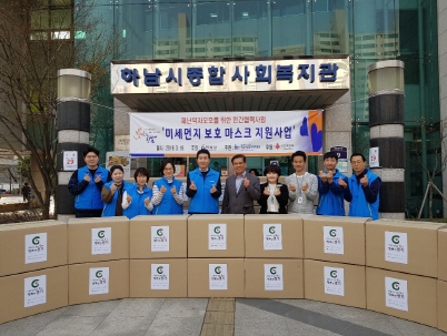 2019 저소득계층 미세먼지 보호 마스크 지원 사업 전달식 작성일 : 2019.03.19 | 조회수 : 11838 2019년 3월 19일(화) 16:00~17:00 하남시와 하남시종합사회복지관은 민관협력사업으로 취약계층 건강보호를 위해 경기사회복지공동모금회 후원으로 미세먼지 보호 마스크를 저소득 어르신 및 취약계층 3,033명에 60,660장을 행정복지센터를 통해 전달했습니다. 앞으로도 민관이 협력하여 취약가정 지원을 위해 더 힘쓰겠습니다.