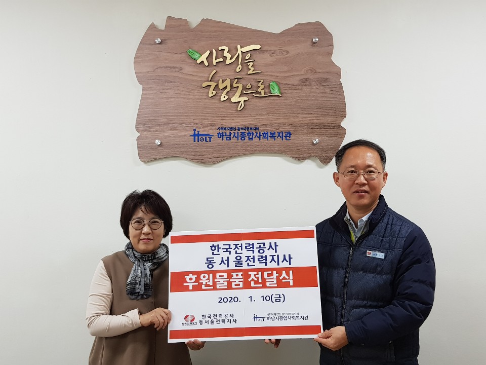 한국전력공사 동서울전력지사 후원물품 전달식 작성일 : 2020.01.10 | 조회수 : 12880 한국전력공사 동서울전력지사에서 "우리 지역의 어려운 이웃들이 명절만큼은조금이나마 따뜻하게 보내셨으면 좋겠습니다.즐거운 명절 되세요!"라며,후원물품을 후원해 주셨습니다.한국전력공사 동서울전력지사 임직원분들께 감사드리며, 지원이 필요한 가정을 위해 사용하도록 하겠습니다.늘 변함없는 지속적인 후원에 다시 한 번 감사드립니다.