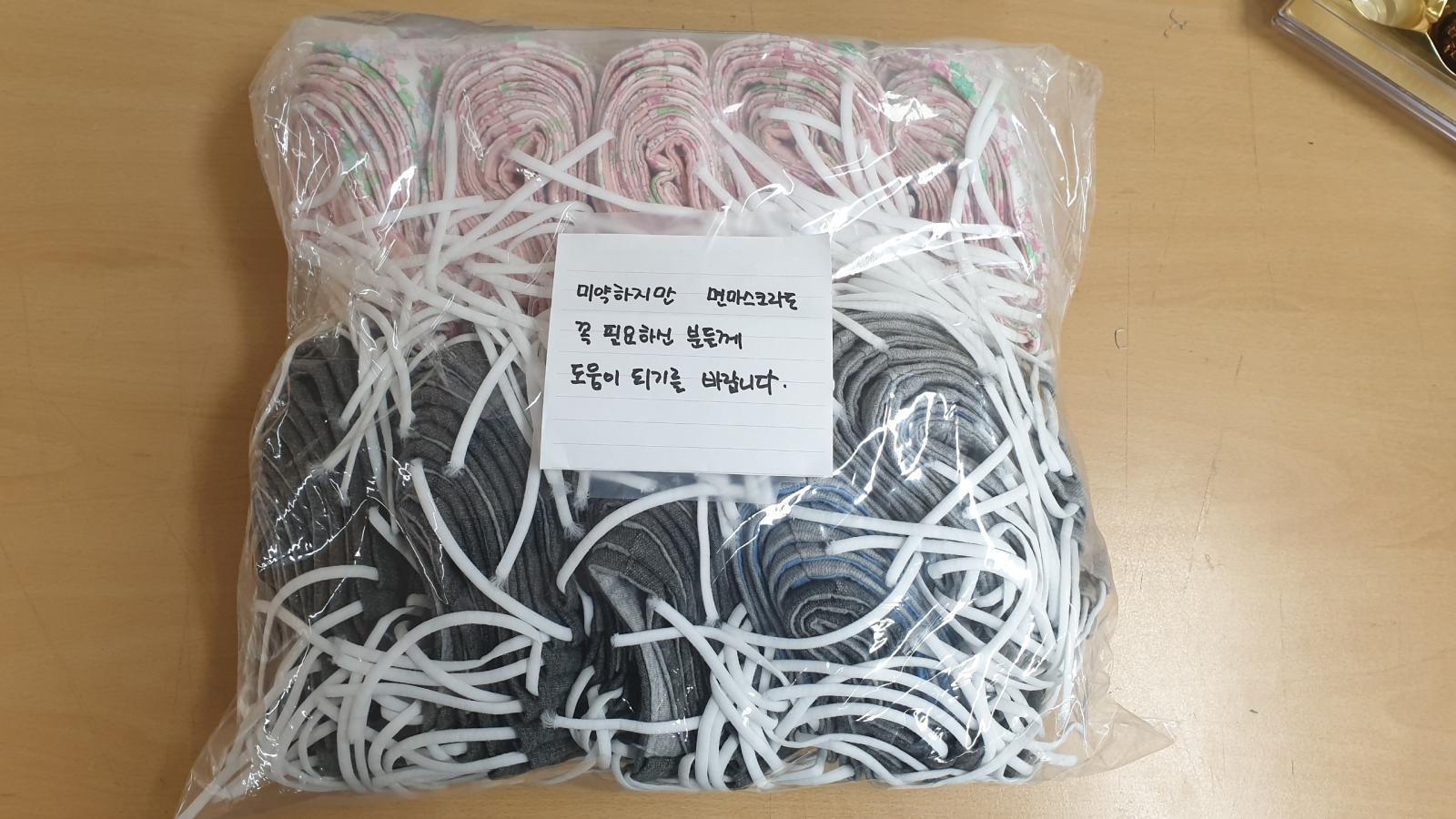 면마스크 후원 작성일 : 2020.03.16 | 조회수 : 13138 지역주민 한 분이 복지관에 직접 만든 면마스크를 후원해주셨습니다."미약하지만 면마스크라도 꼭 필요하신 분들께 도움이 되기를 바랍니다."라는 쪽지와 함께직접 만든 면마스크 100장이 복지관에 전달되었습니다.후원해주신 마스크는 보건에 취약한 어르신 및 아동 가정에 전달할 예정입니다^^ 감사합니다.