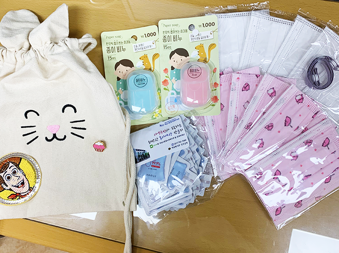 개별방역용품(포장마스크, 일회용손소독제, 종이비누, 마스크목걸이, 에코가방 등)을