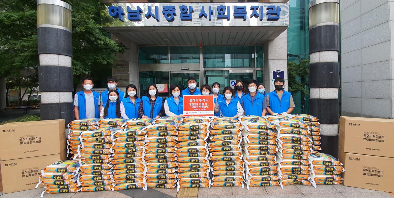 (주)플레이투게더 후원물품 전달식 작성일 : 2020.09.17 | 조회수 : 12174 (주)플레이투게더 에서 후원물품을 지원해 주셨습니다.이희수 대표는 “명절에 소외된 우리 이웃에게 조금이나마 도움이 되었으면 좋겠다.”고 전했습니다. 후원해 주신 소중한 후원물품(백미10kg 200포 및 마스크 10,000장)은 저소득 가정에 전달될 수 있도록 하겠습니다.