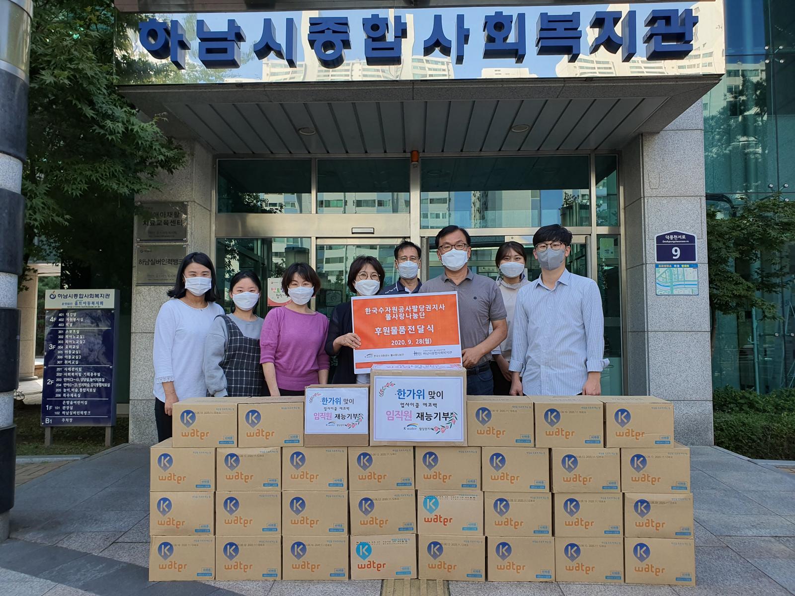 한국수자원공사 팔당권지사 후원물품 전달식 작성일 : 2020.09.28 | 조회수 : 13577 한국수자원공사 팔당권지사 에서 후원물품을 지원해 주셨습니다.박정수 지사장은 “경제적·환경적으로 어려움을 겪고 있는 가정에 희망을 전달하는 소중한 기회가 되기를 바란다. 앞으로도 취약계층 지원을 위한 다양한 사회공헌활동을 추진하겠다.”고 전했습니다. 후원해 주신 소중한 장학금과 후원물품(병물)은 저소득 가정에 전달될 수 있도록 하겠습니다.
