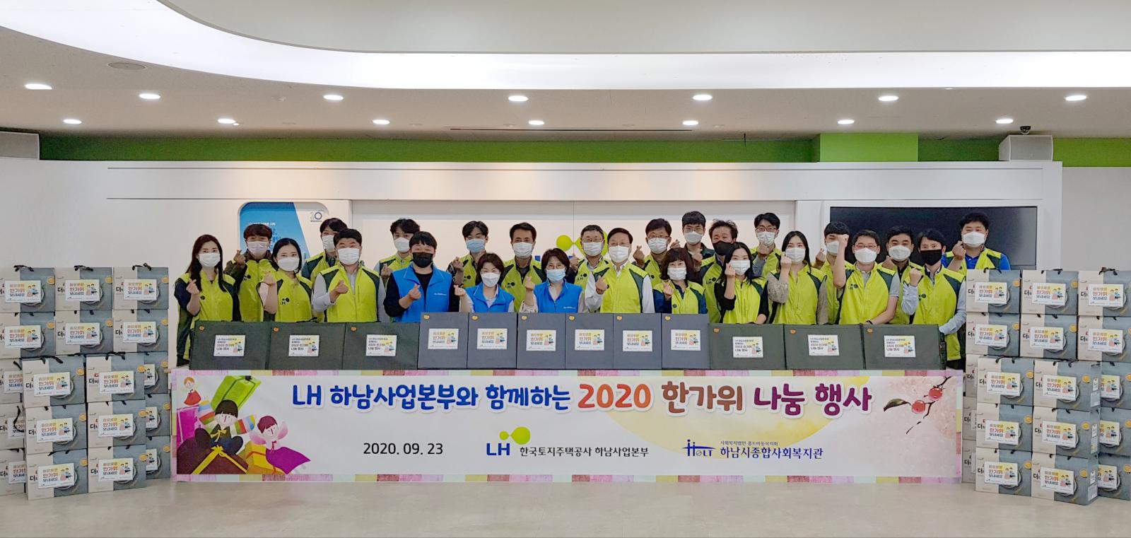 LH한국토지주택공사 하남사업본부 명절선물 전달식 작성일 : 2020.09.23 | 조회수 : 10940 LH한국토지주택공사 하남사업본부에서 명절선물을 지원해 주셨습니다.박정우 본부장은 “이번 한가위 나눔 행사를 통해 코로나19로 어려움을 겪고 있는 가정에 힘이 되기를 바란다."고 전했습니다. 후원해 주신 소중한 후원물품은 명절에 소외된 저소득가정에 전달하겠습니다.