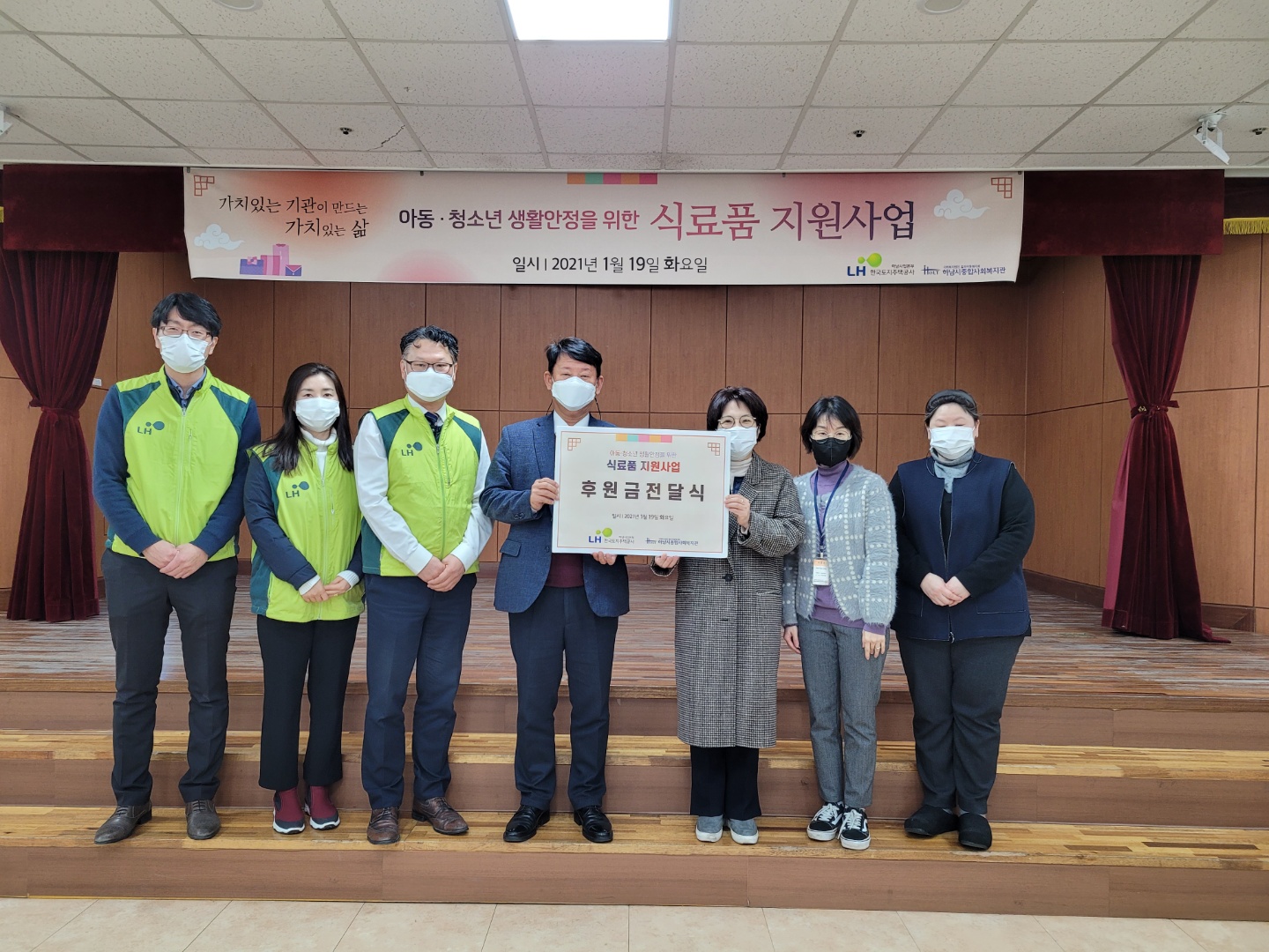 LH한국토지주택공사 하남사업본부 후원금 전달식 작성일 : 2021.01.18 | 조회수 : 12508 LH한국토지주택공사 하남사업본부 유석태 본부장님과 임직원분들이 함께"코로나19에 어려움을 겪고 있는 한부모 및 조손가정에 도움이 되고 싶다."며, 소중한 후원금을 복지관에 후원해 주셨습니다. 본 후원금은 하남시 지역내 한부모 및 조손가정에 식료품키트를 구성하여 잘 전달 하겠습니다. 후원에 다시한번 감사드립니다.