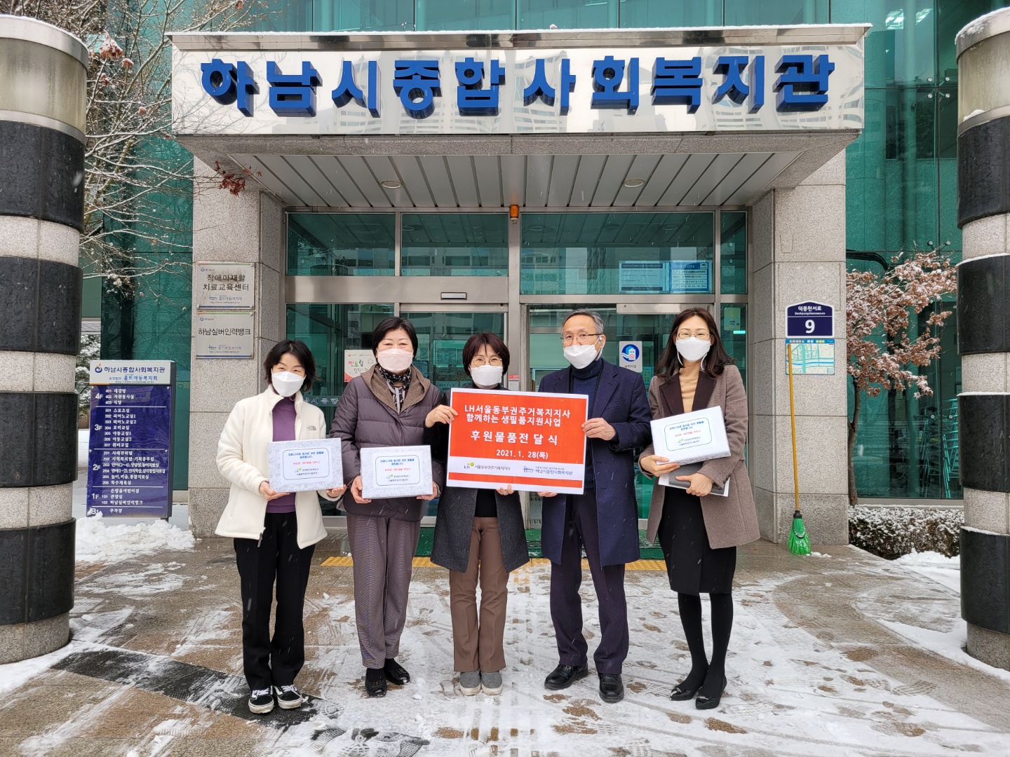 LH서울동부권주거복지지사 방한용품 전달식 작성일 : 2021.01.28 | 조회수 : 13882 LH서울동부권주거복지지사 김정기 지사장님과 임직원분들이 함께"추운 겨울 어려운 이웃들에게 도움이 되었으면 좋겠다."며, 소중한 방한용품을 복지관에 후원해 주셨습니다. 본 후원금은 하남시 지역내 저소득가정에 잘 전달 하겠습니다. 후원에 다시한번 감사드립니다. .