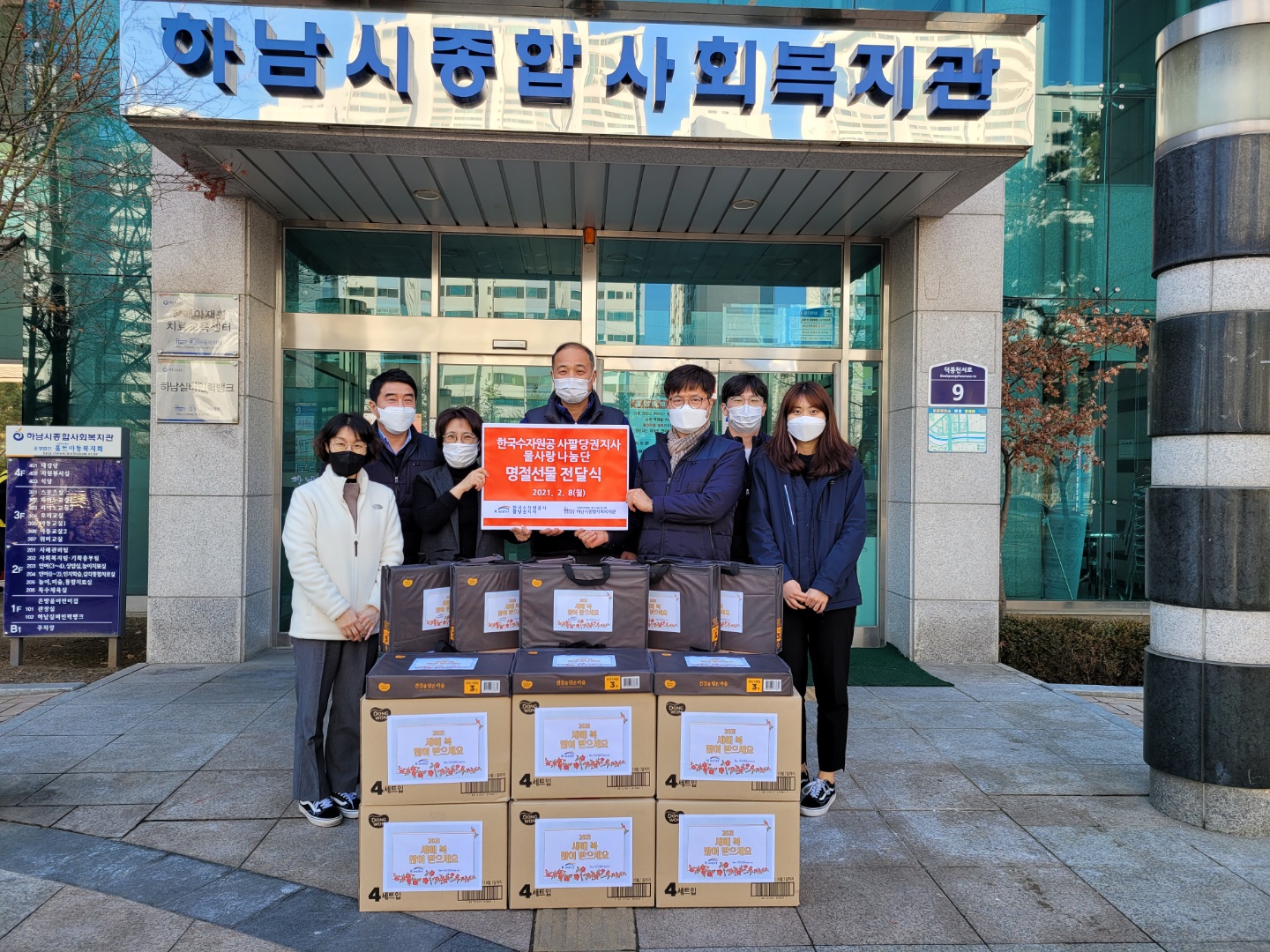 한국수자원공사 팔당권지사 명절선물 전달식 작성일 : 2021.02.09 | 조회수 : 13072 한국수자원공사 팔당권지사(지사장 박정수) 임직원분들이 함께"따뜻한 설명절 보내시길 바란다."며,소중한 명절선물을 복지관에 후원해 주셨습니다.명절선물은 하남시 지역내 저소득가정에 잘 전달 하겠습니다.후원에 다시한번 감사드립니다.