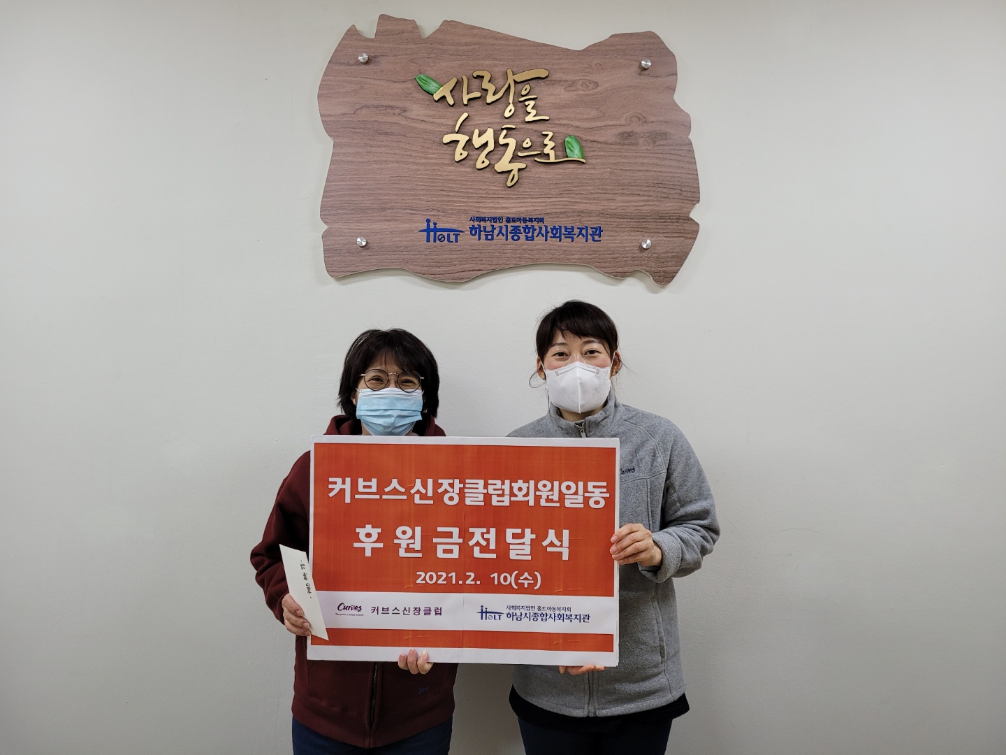 커브스 신장클럽 하남시종합사회복지관 후원금 전달 작성일 : 2021.02.10 | 조회수 : 12428 커브스 신장클럽(대표 김선화) 회원들이 함께"코로나19 여파로 더욱 외롭고 힘들 시기를 보내는 우리 이웃들에게 도움이 되기를 바란다."며,회원들이 직접 기부한 후원금을 복지관에 후원해 주셨습니다.하남시 지역내 저소득가정 지원을 위해 사용하겠습니다. 후원에 다시한번 감사드립니다.