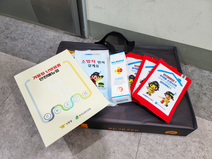 화재대피용 방연마스크 숨수건, 손소독제를 전달해드렸습니다.