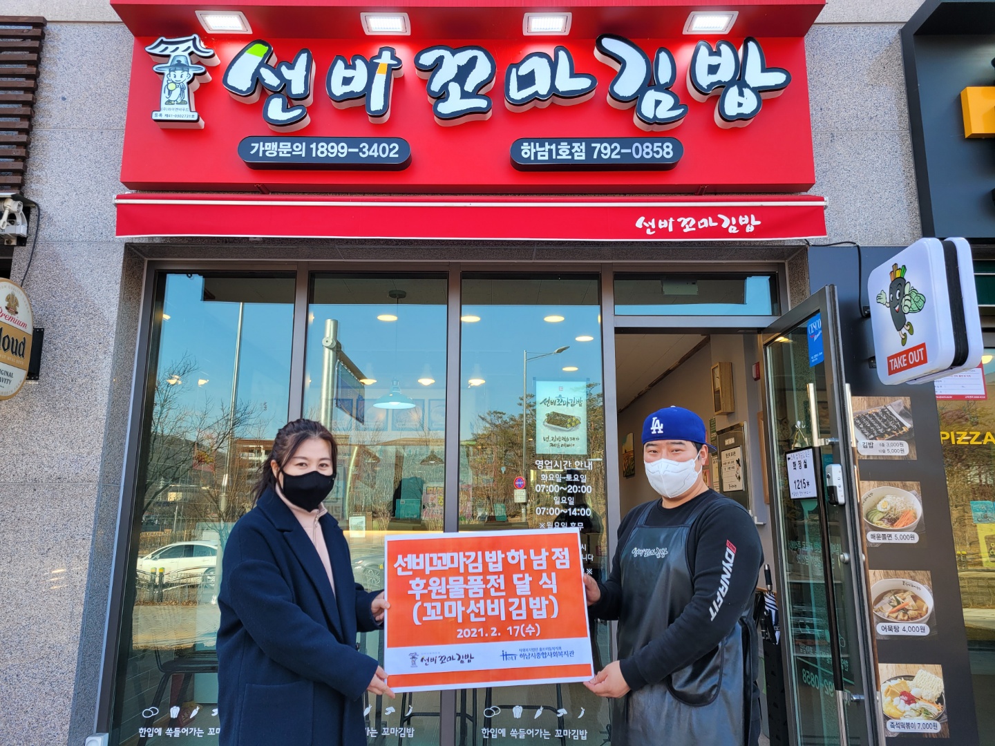 선비꼬마김밥[하남1호점] 후원물품 전달식 작성일 : 2021.02.17 | 조회수 : 11815 선비꼬마김밥[하남1호점] 박진관 사장님과 직원분들이 함께"작은 나눔이 아이들에게 작은 기쁨과 행복한 시간이 되었으면 좋겠다."며, 꼬마선비김밥을 복지관에 후원해 주셨습니다. 든든하고 맛있는 한끼가 될 수 있도록 잘 전달 하겠습니다. 소중한 후원에 다시 한번 감사드립니다.