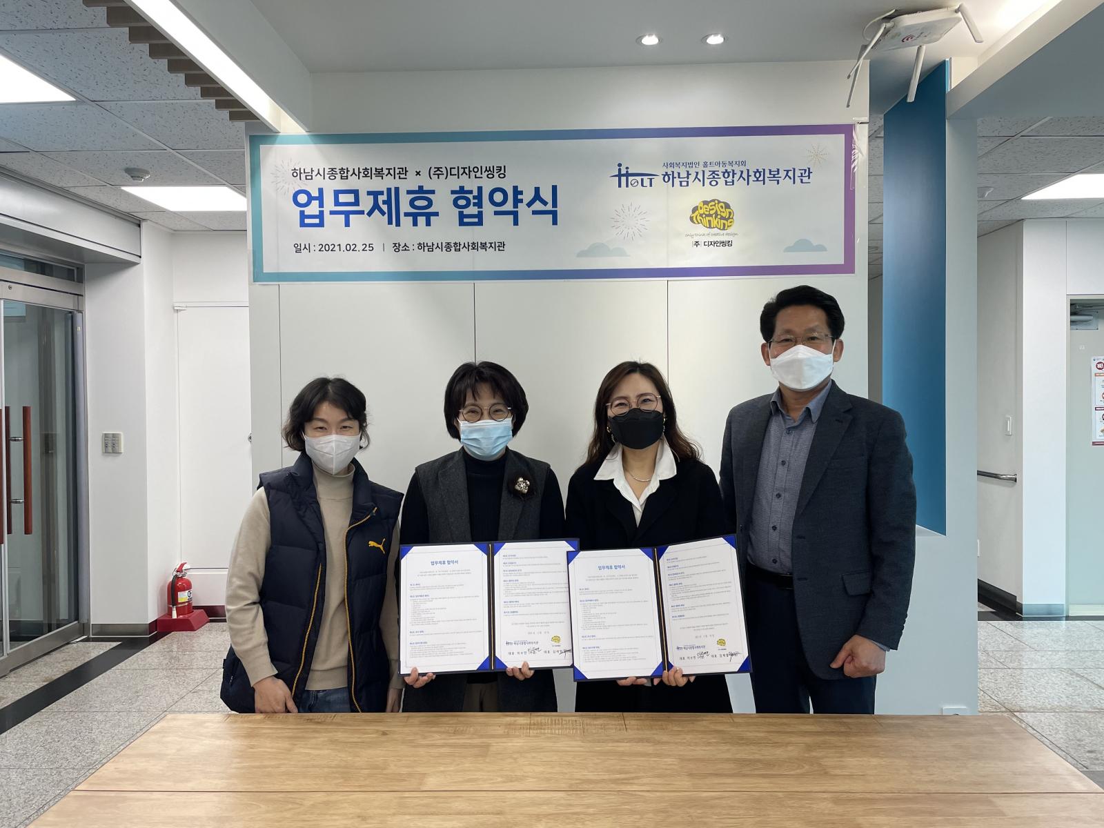 (주)디자인씽킹 업무협약식 진행 작성일 : 2021.02.25 | 조회수 : 11899 (주)디자인씽킹과 함께 대상자별 맞춤형 힐링프로그램을 지역주민들에게 제공하기 위한 업무협약식을 진행하였습니다.복지관에서는 지역주민들의 건강한 마음을 위해다양한 마음건강 프로그램을 제공하도록 노력하겠습니다.