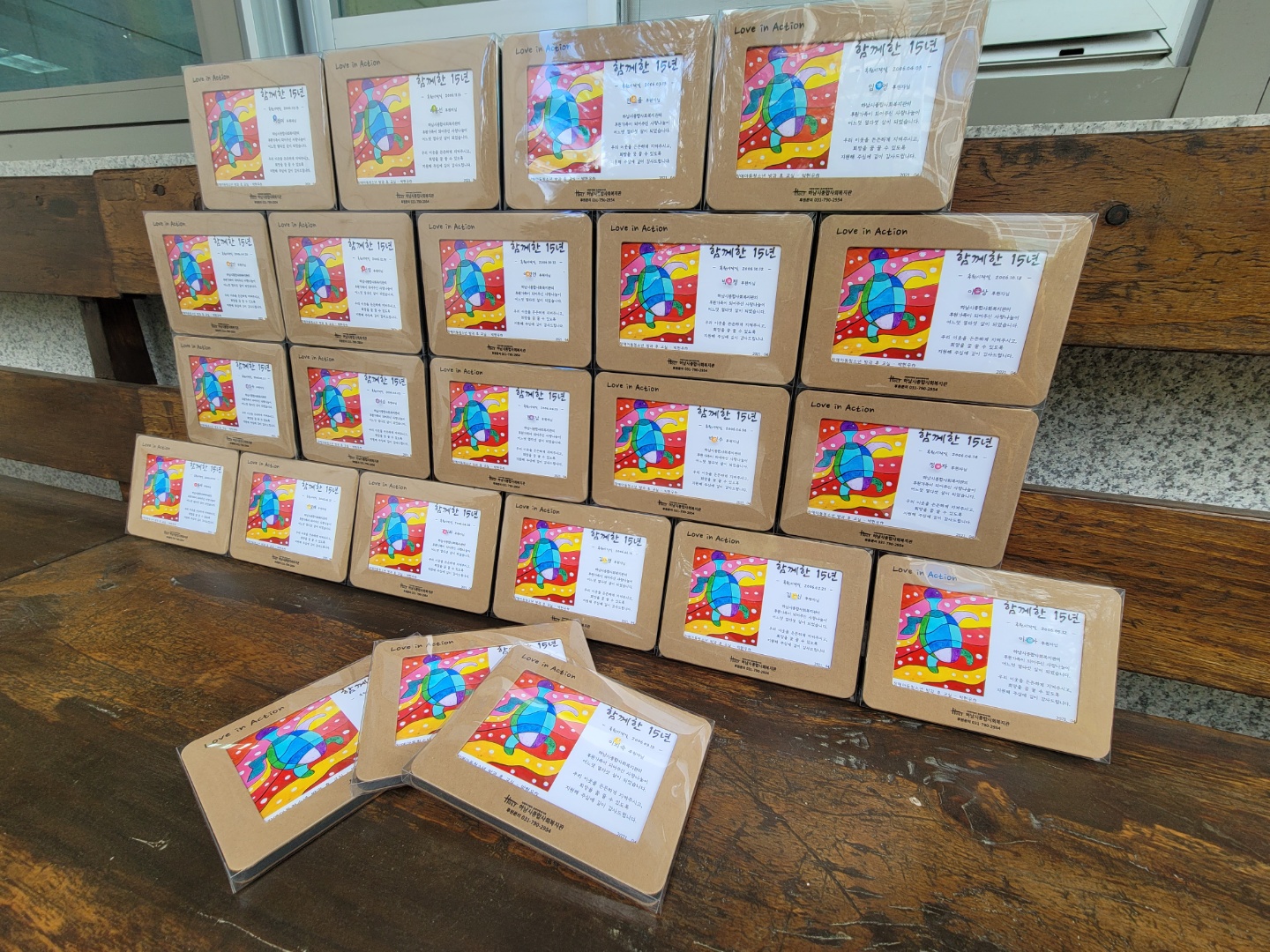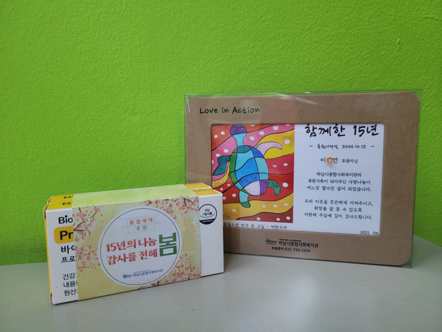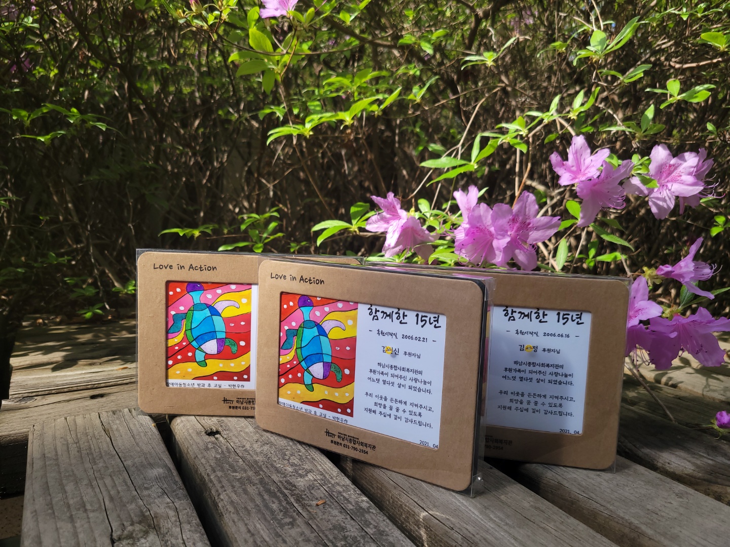 후원 15주년 장기후원자 기념액자 전달 작성일 : 2021.04.22 | 조회수 : 12953 하남시종합사회복지관과 후원가족이 되어, 15년 동안 변함없는 사랑과 관심으로 후원해 주신분들께 기념액자를 전달하였습니다.보내주시는 소중한 후원금은 우리 지역사회의 도움의 손길이 필요한 이웃에게 다양한 복지서비스를 제공하여,희망을 잊지 않고 새로운 미래를 꿈꿀 수 있는 기회가 되었습니다.항상 따뜻한 힘이 되어주셔서 감사드립니다.*개인정보보호를 위하여, 명단 공개를 하지 못합니다. 양해부탁드립니다.연락처가 변경되어, 복지관에 등록된 주소지에 우편으로 연락을 드렸으나 답신이 오지 않아 기념액자를 아직 전달 하지 못한 후원가족 분들이 있습니다. 혹시 이 글을 읽으시면 복지관 후원담당자에게 꼭 연락 부탁드립니다.*