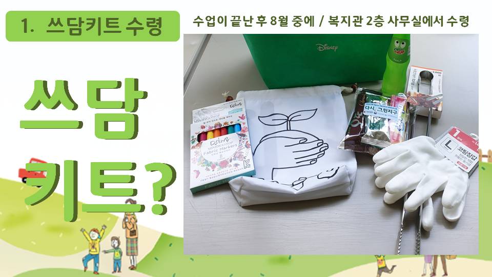 * 쓰담키트 수령 : 8월 중 아무때나 교육 종료 후에도 수령가능 (평일 09:00~12:00, 평일 13:00~18:00)