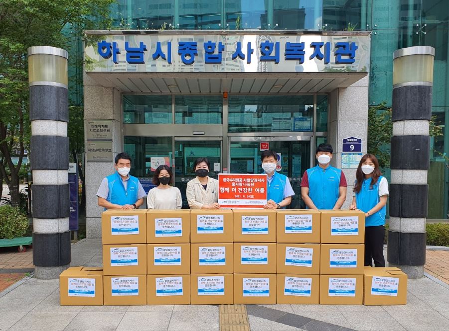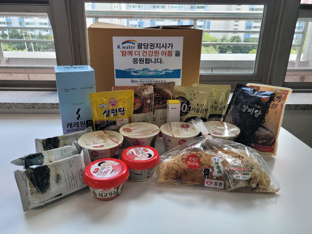 한국수자원공사 팔당권관리단 '함께 더 건강한 여름' 물품 전달식 작성일 : 2021.08.20 | 조회수 : 10277 15종으로 구성된 식료품보양키트 포장한국수자원공사 팔당권지사(지사장 박정수) 임직원분들이 함께"코로나19와 폭염으로 힘든 시간을 보내고 있는 이웃의 건강관리에 도움이 되었으면 좋겠다."며,원기회복을 위한 보양키트를 복지관에 후원해 주셨습니다.보양키트는 하남시 지역내 저소득가정에 잘 전달 하겠습니다.후원에 다시한번 감사드립니다.