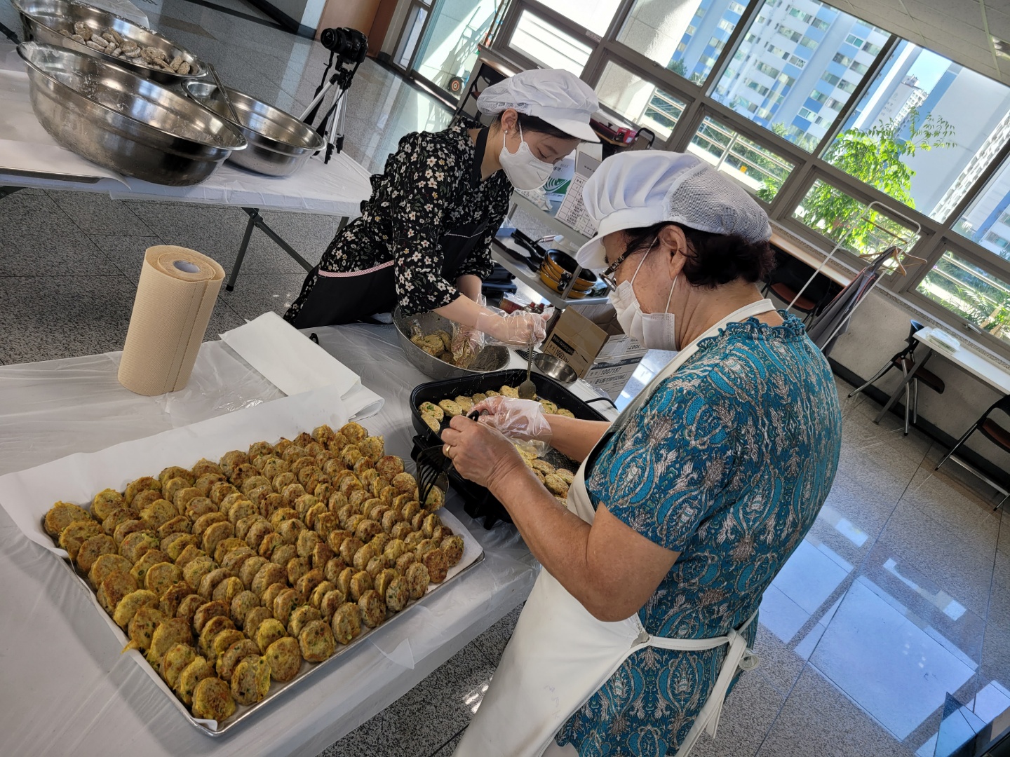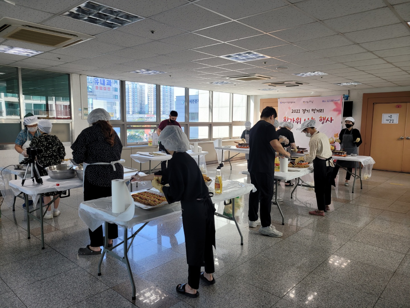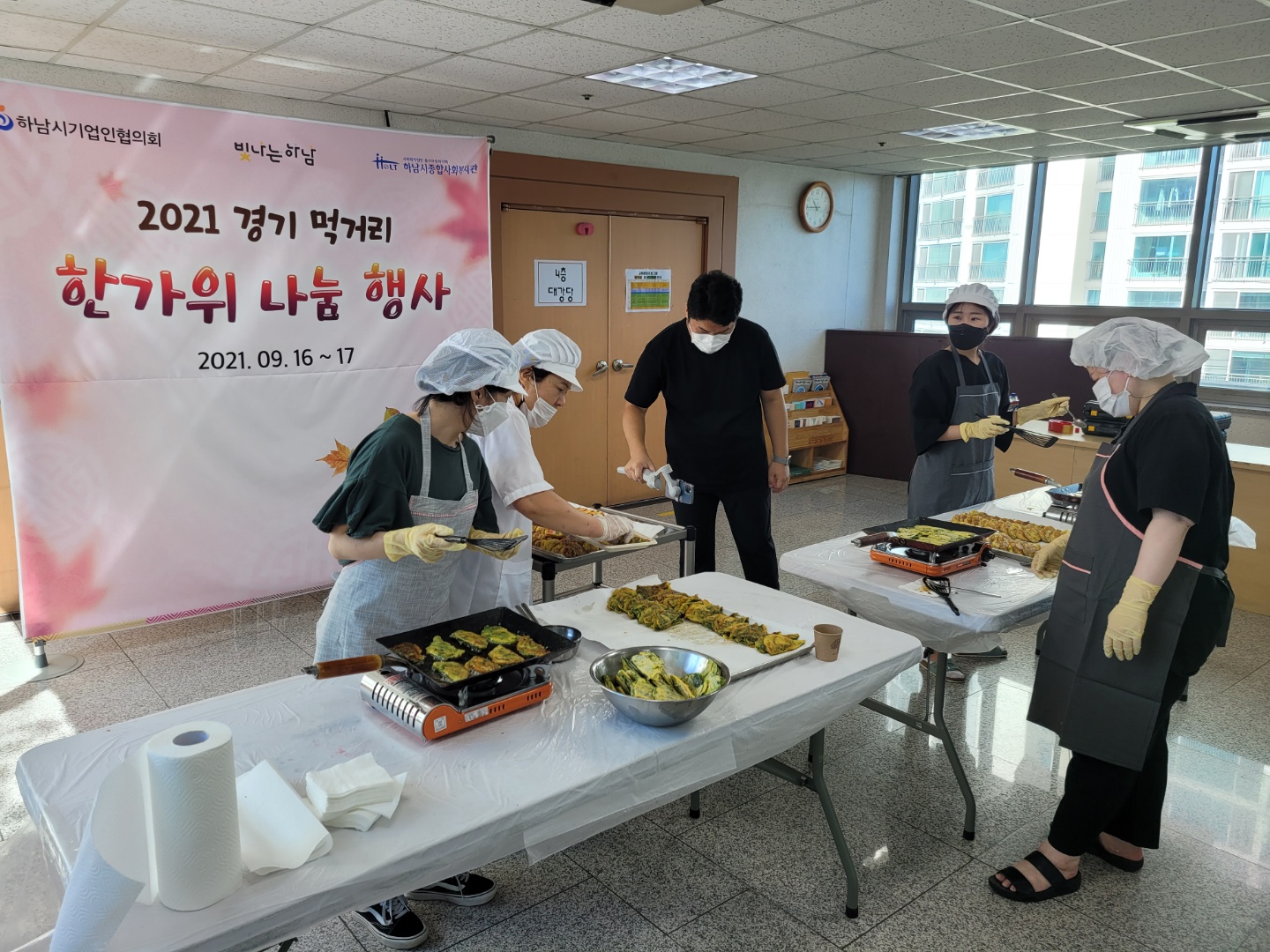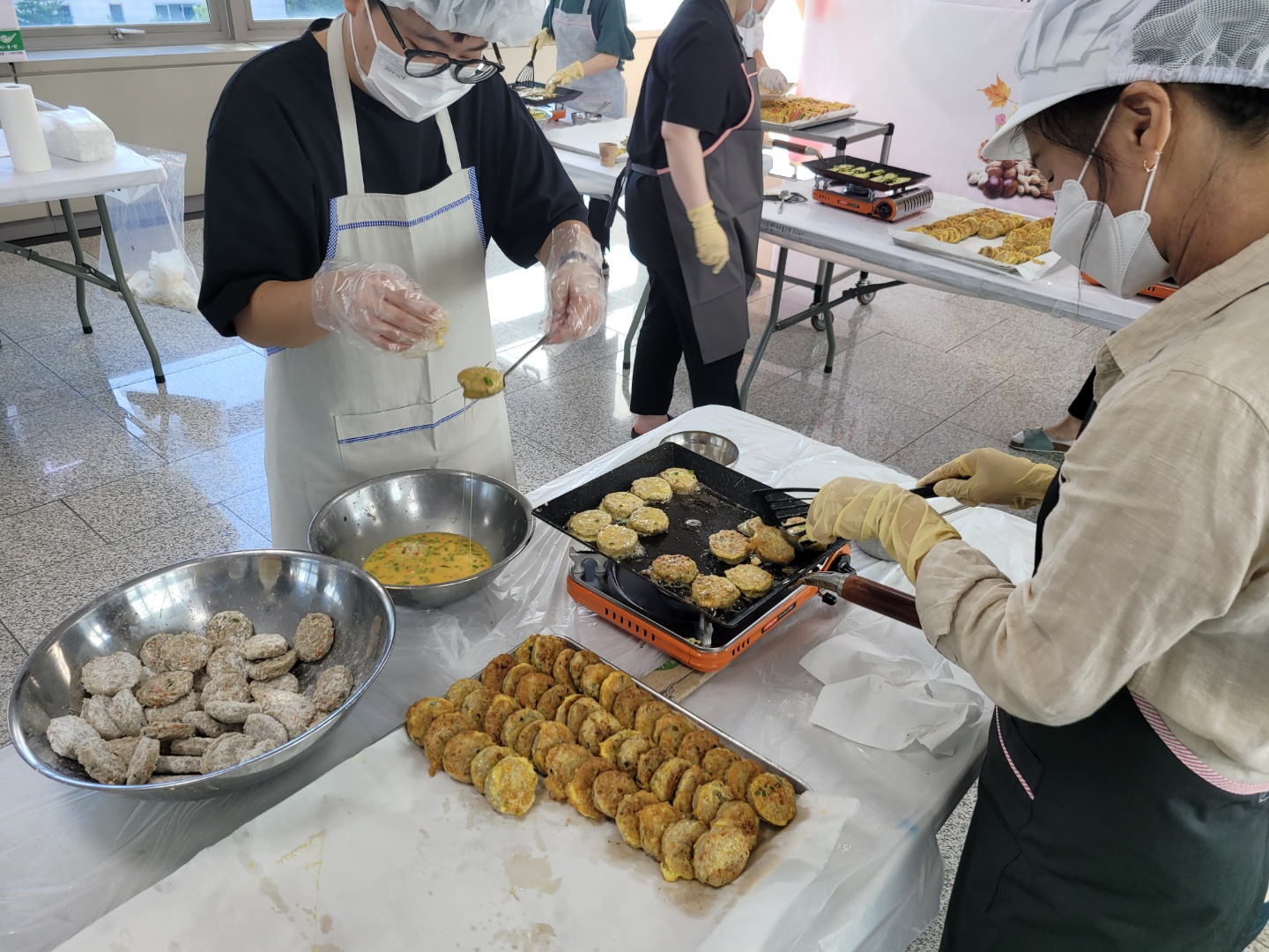 이날 전달할 꾸러미를 만들기 위해 자원봉사자들이 직접 전을 만들고,