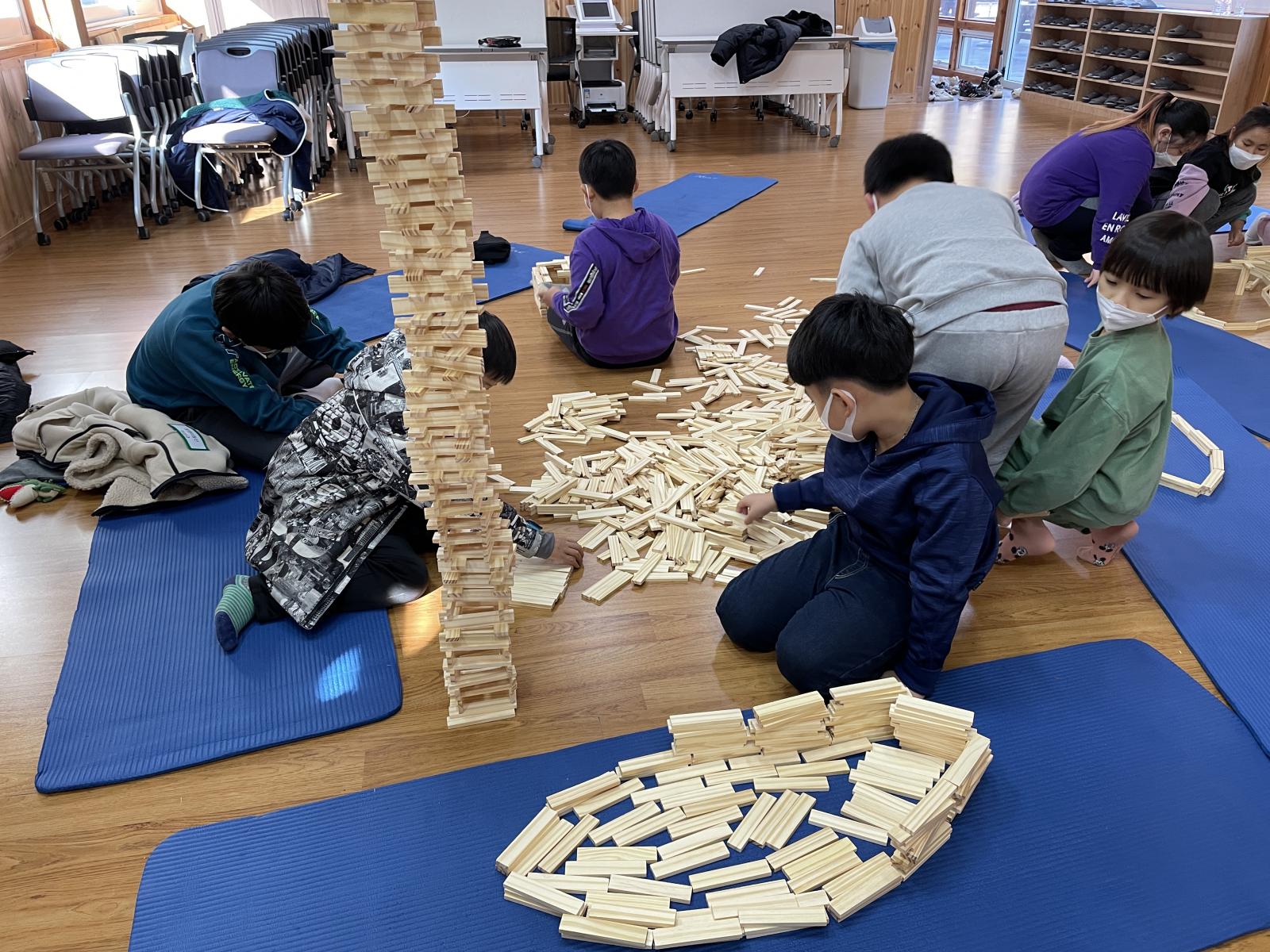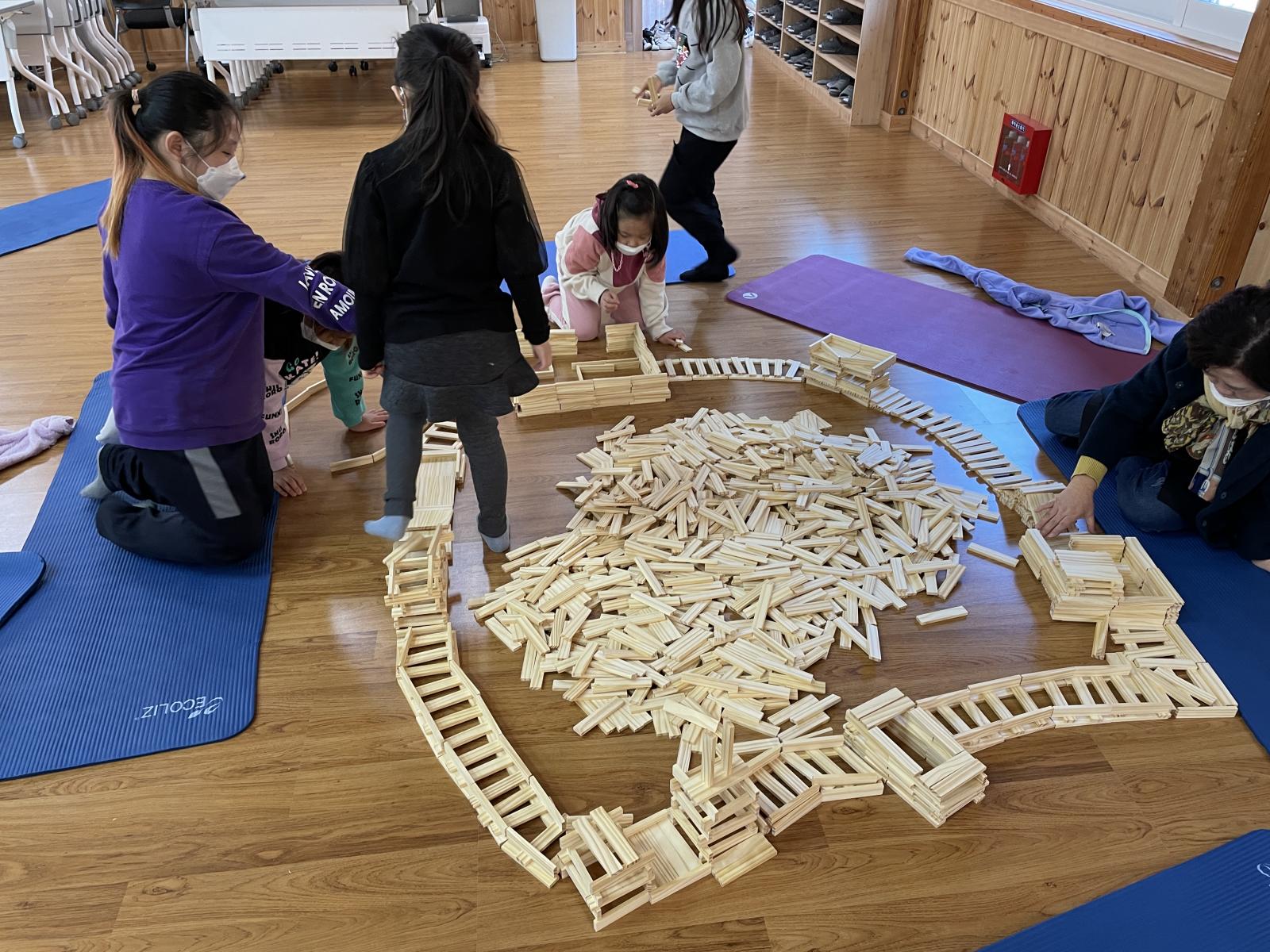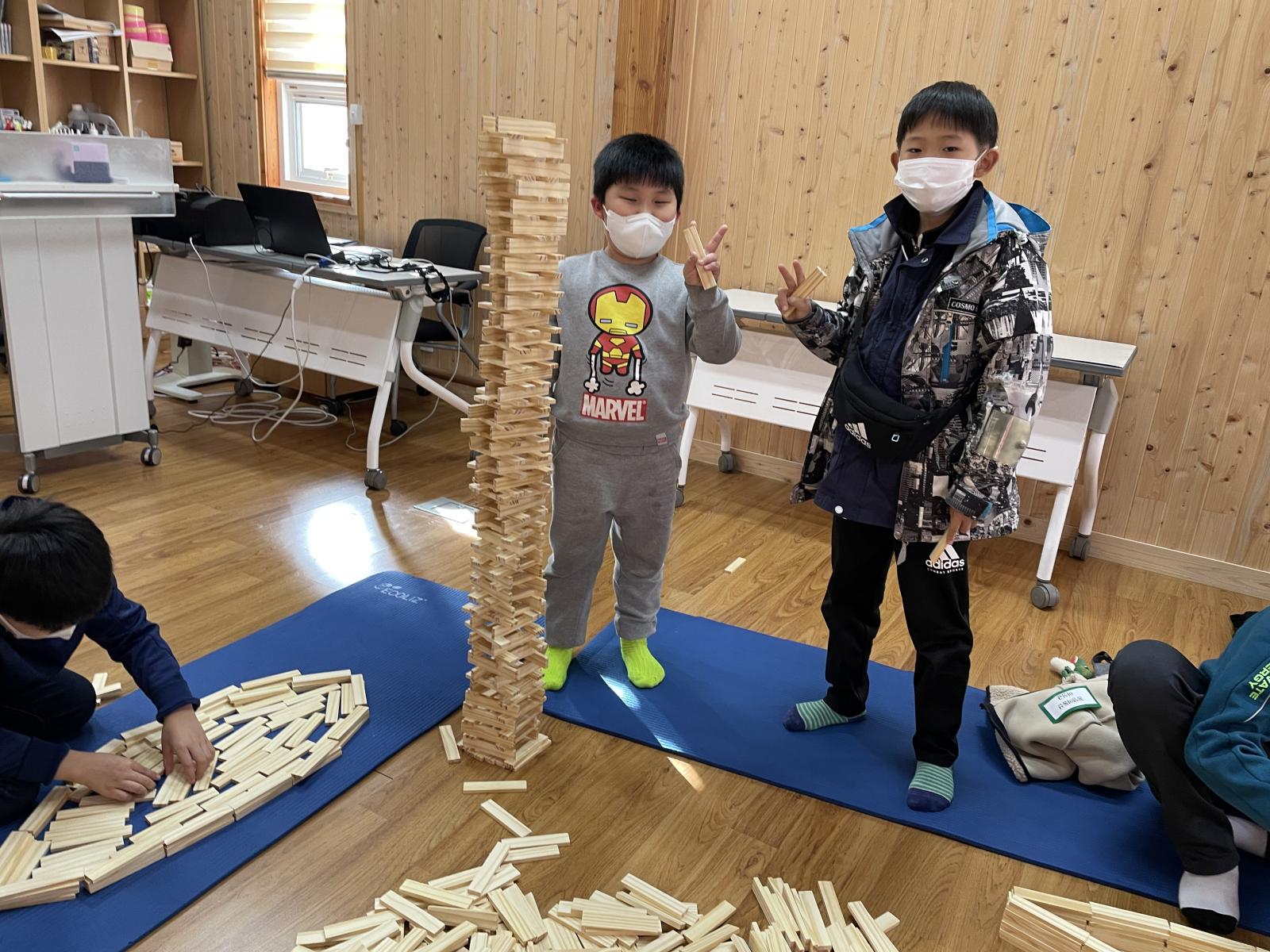 작은 나무조각들로 아이들 키 보다 큰 탑을 만들었네요!