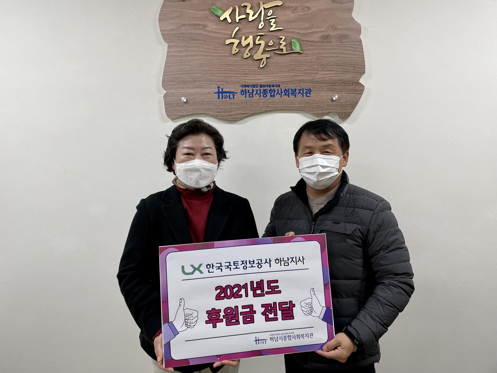 LX 한국국토정보공사 하남지사 후원금 전달 작성일 : 2021.12.14 | 조회수 : 8205 한국국토정보공사 하남지사에서 12월 10일 하남시 지역주민을 위해 사용해달라며후원금을 전달해주셨습니다. 전달식에 참석한 이종로 수석팀장은“그동안 봉사를 통해 많은 것을 배웠다. 지역사회 내 공공기관으로서 역할을 성실히 수행하고 싶다.”라고 전해주셨습니다. 전해주신 후원금은 지역사회를 위해 소중히 사용하겠습니다.다시 한 번 감사드립니다.