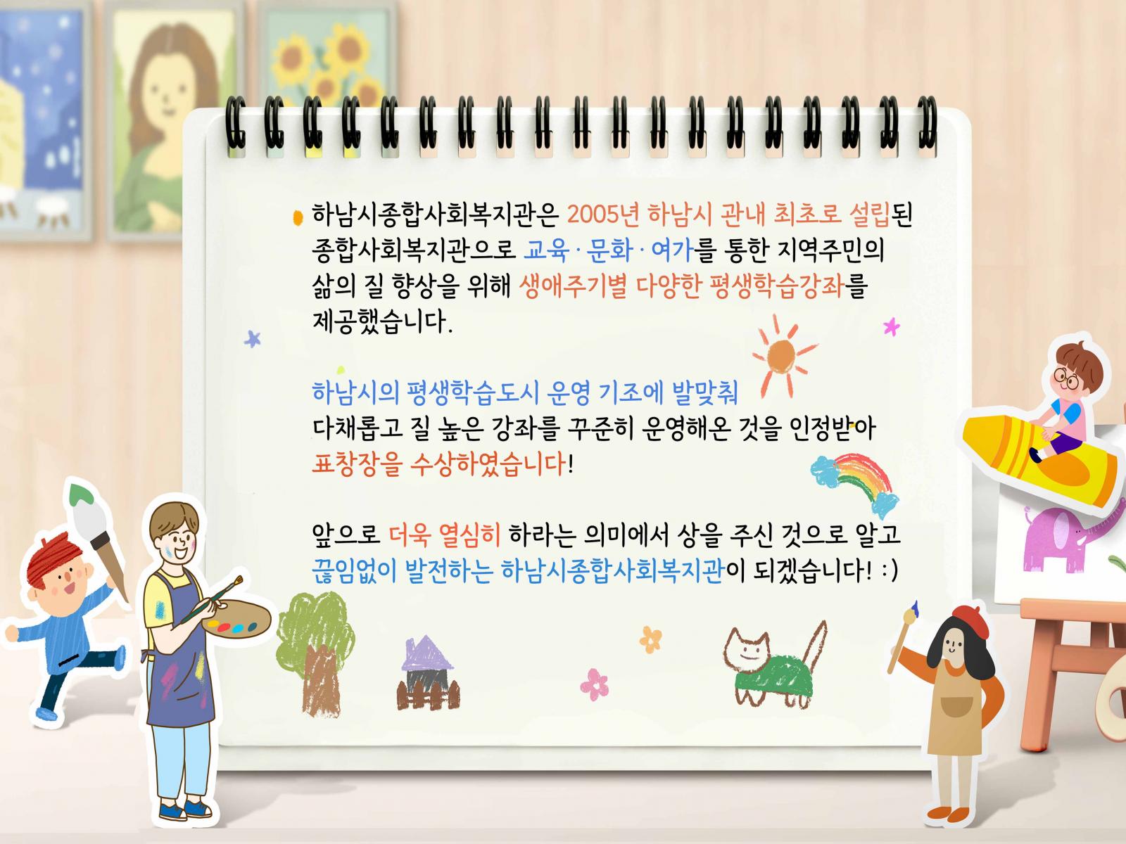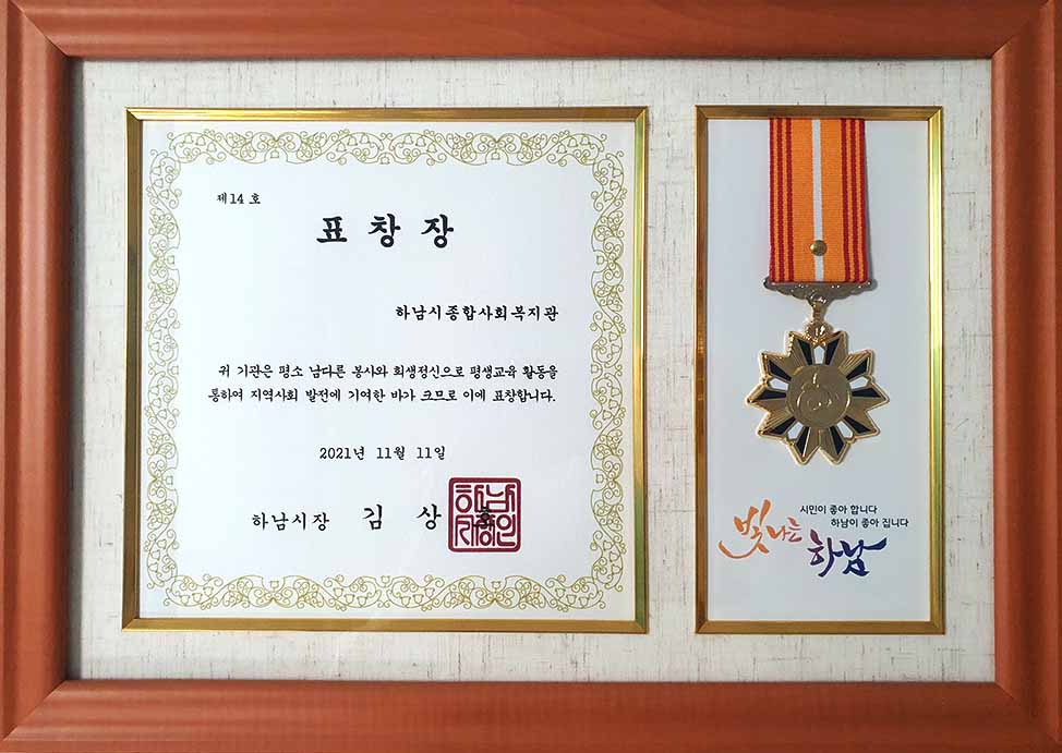 하남시종합사회복지관 평생교육 표창 2021-12-01 조회수 8,337 하남도시공사와 함께하는 "사랑의 연탄" 지원 사업 2021-11-26 조회수 9,346 폐현수막 새활용 프로젝트 '보따리' 협약식 및 전달식 진행 2021-11-26 조회수 9,818 ㈜SH한성소방 후원물품 전달식 2021-11-26 조회수 8,657 [인성놀이] "함께 노는 놀이터" 진행 2021-11-22 조회수 8,849 인성함양 프로젝트[숲 체험] 진행 2021-11-22 조회수 9,329 하남시민을 위한 '하종복게임' 행사진행 2021-11-19 조회수 11,470 LH와 함께하는 사랑의 김장나눔! 2021-11-15 조회수 10,045 하남라이온스클럽 후원물품 전달식 2021-11-15 조회수 9,807