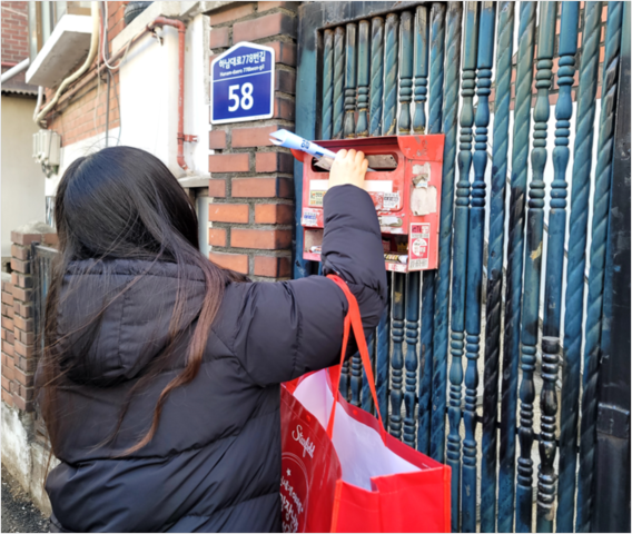 우편함에 홍보지를 넣으며