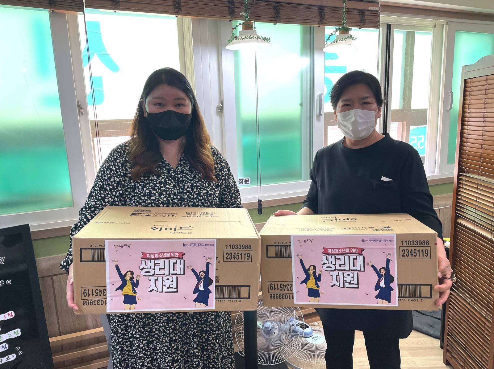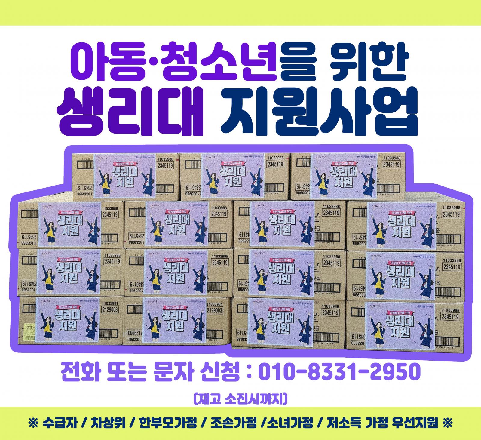 아동청소년을 위한 생리대 지원 실시 작성일 : 2022.06.08 | 조회수 : 8214 하남시 지역 내 아동과 청소년들을 위한 생리대를 지원하고 있습니다.생리대 구입에 어려움이 있는 친구들이 쉽게 접근할 수 있도록 전화 또는 문자로도 신청받고 있으니 언제든지 편한 방법으로 연락 주세요~!